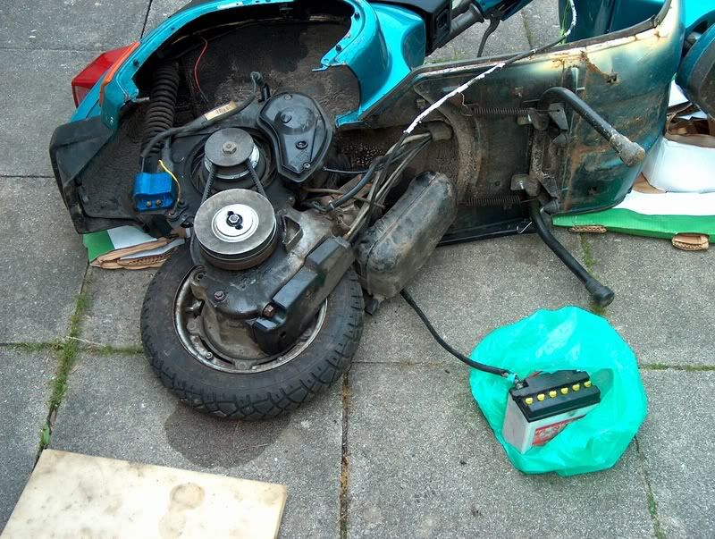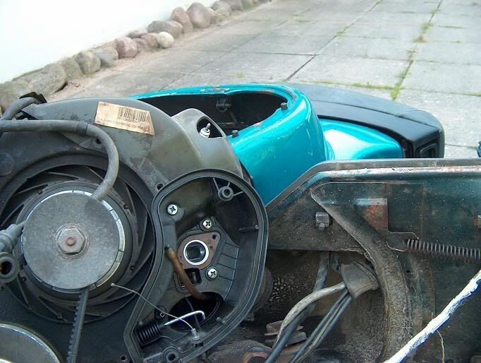 Um diesen Status zu erreichen der wie der Roller sich unten auf dem Bild befindet muss man die Züge lösen und den Motor an der Federrung (Imbus),Traverse (unten im Fußbereich) und die vom vorderren Puffer demontieren