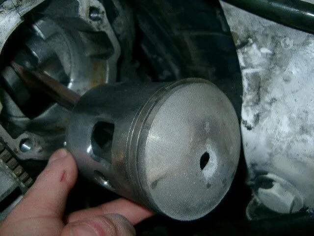 Nach dem ersten defekten Kolben bekam ich von dem S.I.P - Mitarbeiter die Info, dass ich eine falsche Zündkerze drin hatte! Dann habe ich den neuen Kolben eingebaut, die empfohlene Kerze eingebaut und nach 50 km tat es einen Schlag und Die Karre stand wieder und der neue Kolben hatte wieder ein Loch rein gebrannt!