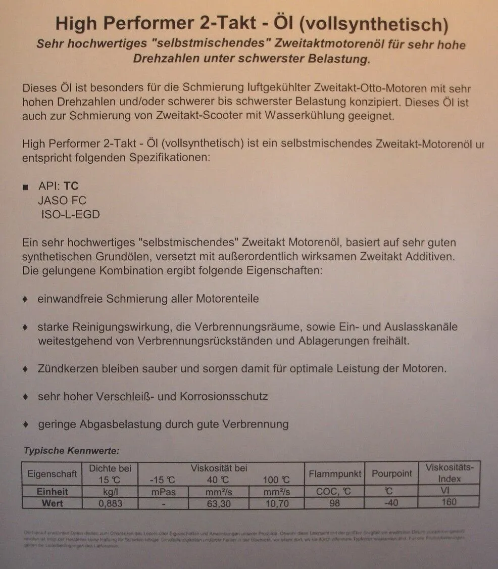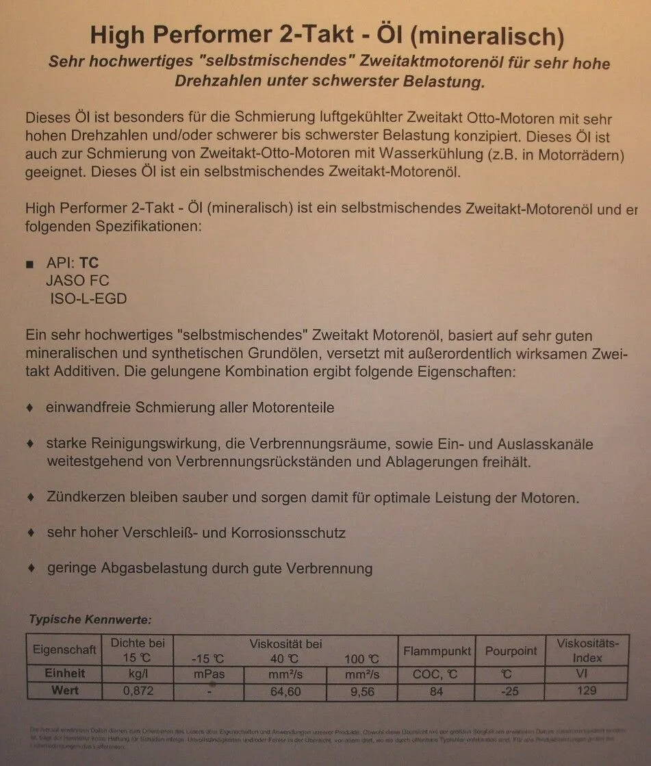 Die Öldiskusionen sind immer wieder herrlich wenn jemand meint das Öl für 20€ ist besser als das für 10€ obwohl beide die gleichen Freigaben haben.....Naja Alternativen zum Öl.... spar einfach an der Menge, ob nun 1:50 oder 1:100, das bekommt der Motor eh nicht mit