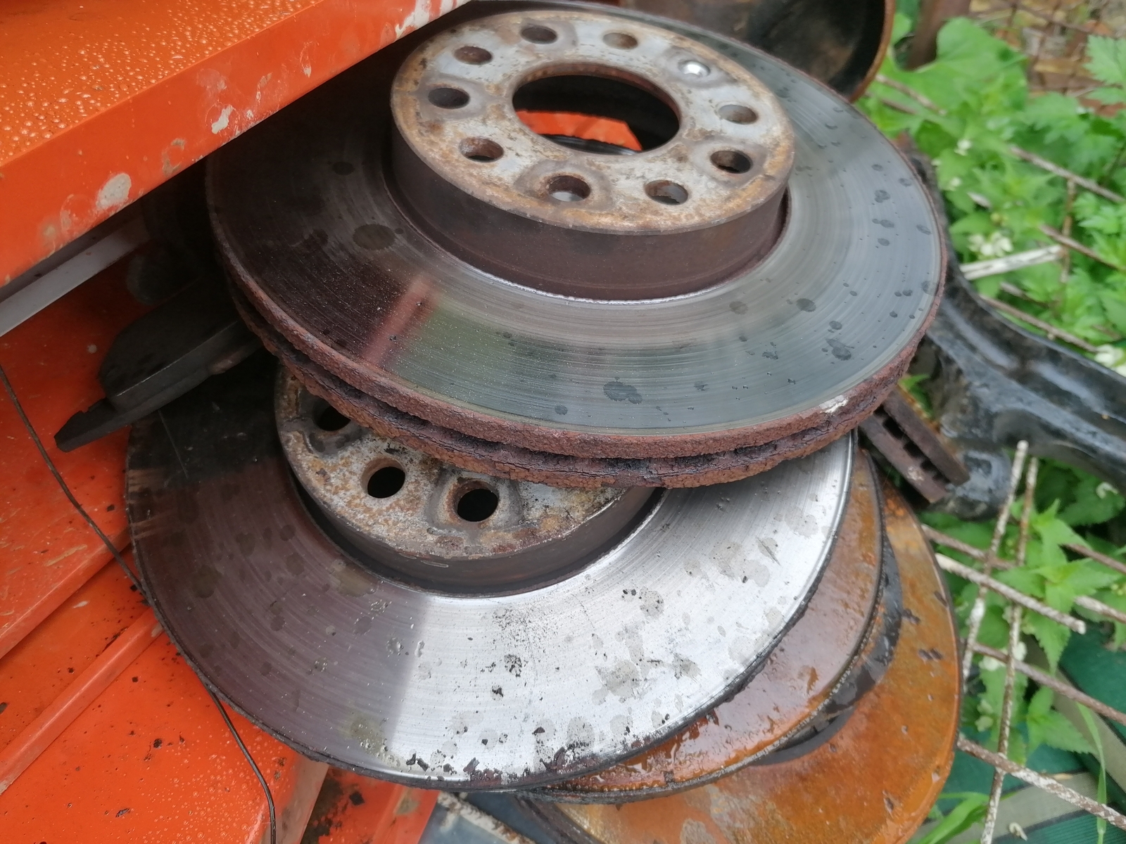 Montag morgens 6 Uhr nach der Nachtschicht. Erstmal die festsitzende Bremse davon überzeugen das sie los lässt. Hat sie dann auch gemacht. Bremsscheiben und Klötze kamen neu. Sattel ist wieder gangbar gemacht worden. Kolben arbeiten tadellos.