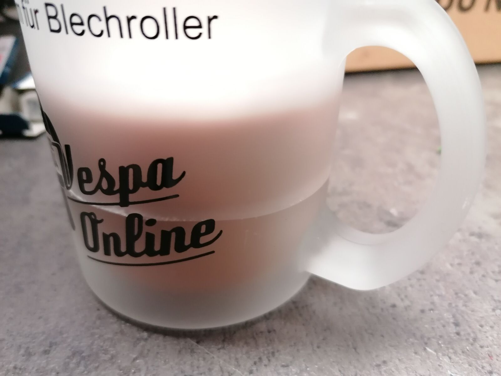 Ihr Killer. Ich hab die Tasse seit Jahren, mit heißem Kaffee, in Gebrauch und die Schrift hat in der Spülmaschine auch gelitten. Aber Glasbruch hatte ich nie.