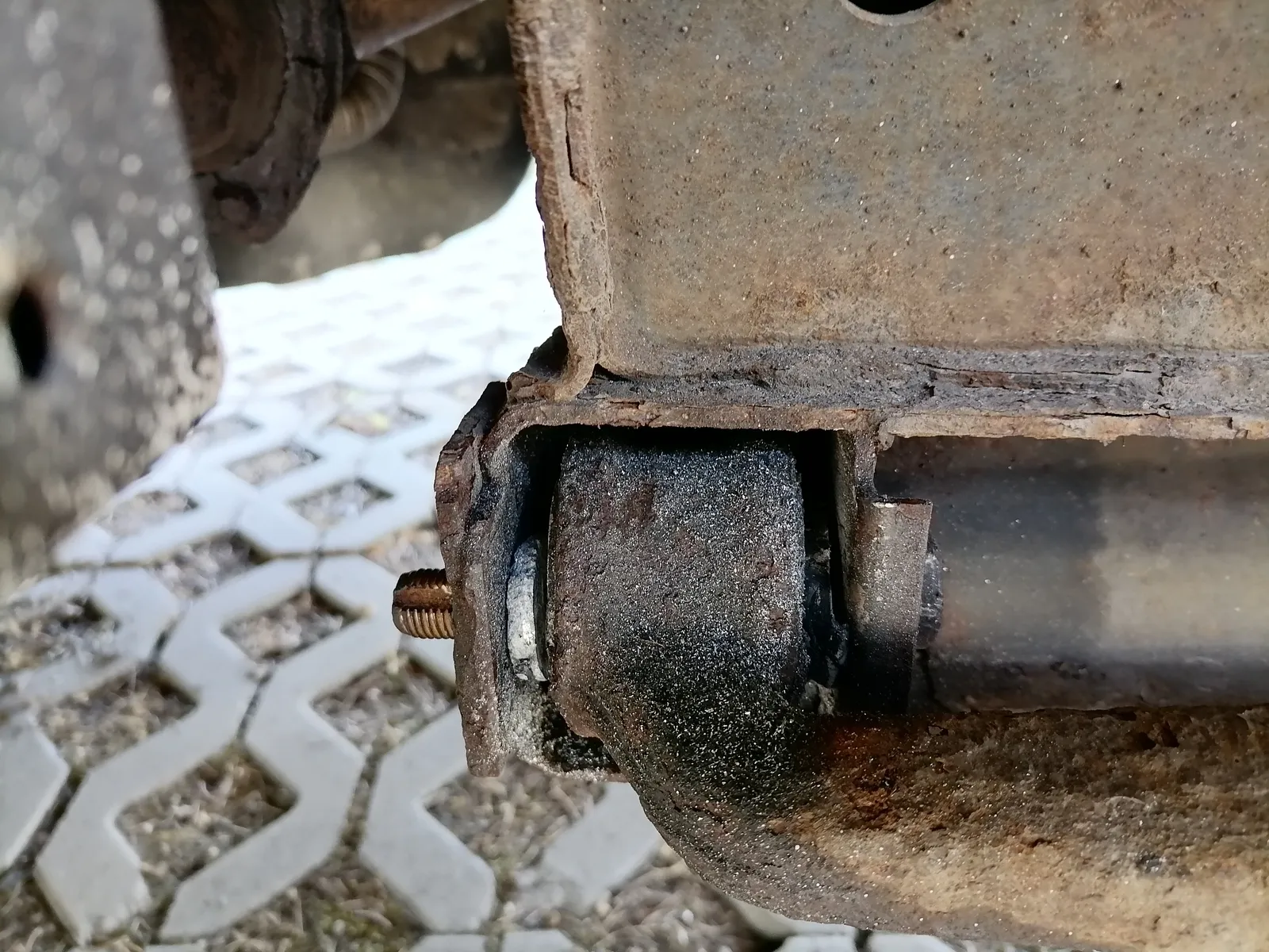 Leider geht der untere Querlenker nicht raus, weil die Schrauben (mehrere Tage mit Rostlöser etc. behandelt) in den Querlenkerbuchsen sich mit den Alubuchsen gemein vereinigt haben... 2kg Hammer keine Chance... also 1/2h mit der Druckluftsäge die Schrauben versucht durchzusägen... mann beachte, dass links die Buchse mitgesägt wurde und immer noch am Gewinde der völlig durchgetrennten Schraube hängt