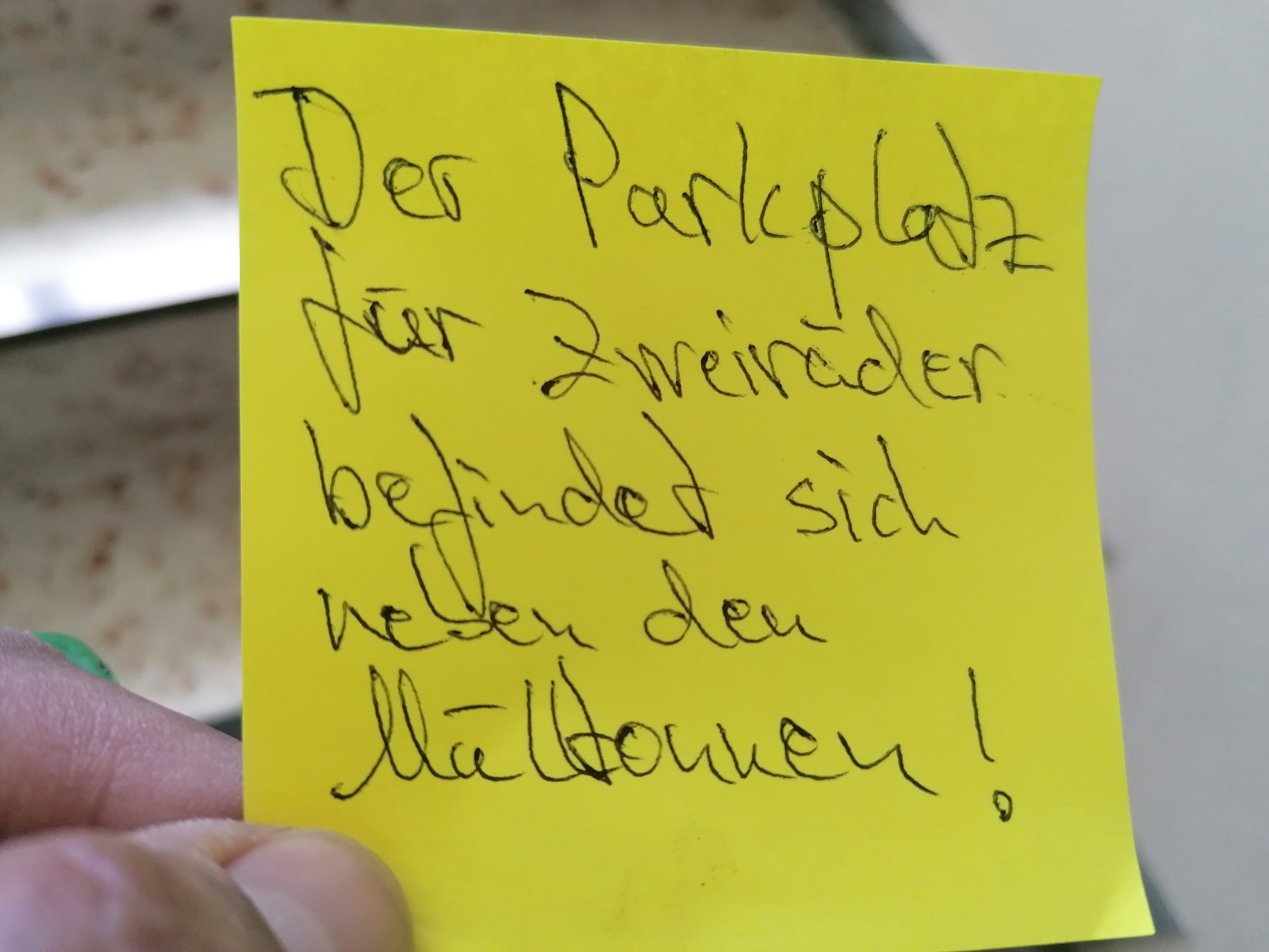 Alles anzeigenAls ich eben aus Münster zurück gekommen bin habe ich die Rally nicht auf den eigentlichen geplasterten Stellplatz gestellt weil der voll inner Sonne war. Eben Wäsche aufhängen, umziehen und dann weiter zur Werkstatt. So war mein Plan. Hat ca 40 min gedauert. Als ich dann runter kam klebte ein kleiner gelber Zettel auf meiner Sitzbank...