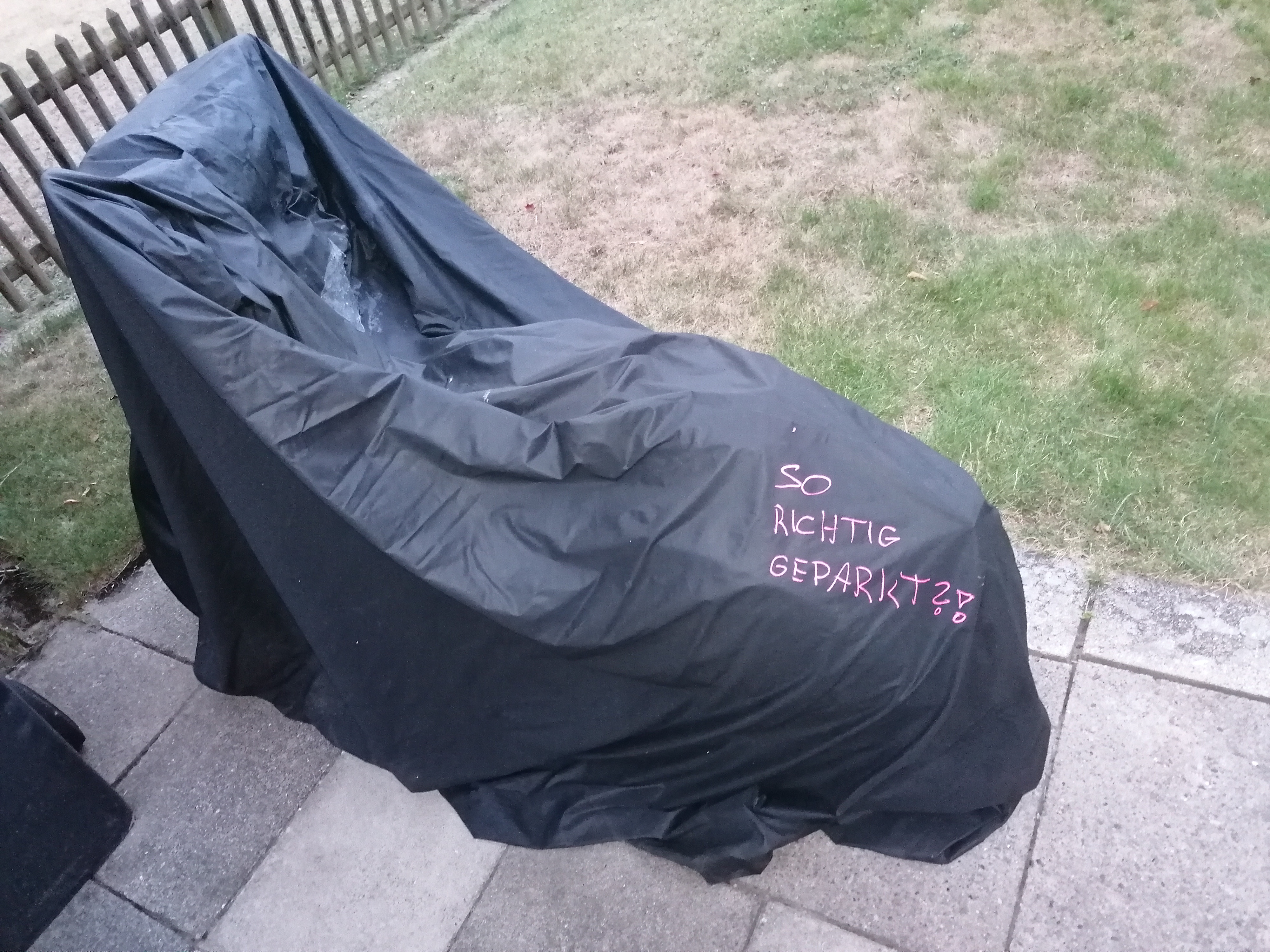 Als ich eben aus Münster zurück gekommen bin habe ich die Rally nicht auf den eigentlichen geplasterten Stellplatz gestellt weil der voll inner Sonne war. Eben Wäsche aufhängen, umziehen und dann weiter zur Werkstatt. So war mein Plan. Hat ca 40 min gedauert. Als ich dann runter kam klebte ein kleiner gelber Zettel auf meiner Sitzbank...