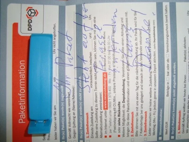 Benachrichtigungszettel ist bei DPD nicht, es sei denn du wohnst um die Ecke von einem Auslieferungslager - bei uns wäre das locker 50 Kilometer entfernt. Der Fahrer kann nur hoffen, dass ein freundlicher Nachbar abnahmebereit ist, wenn er dich nicht trifft.