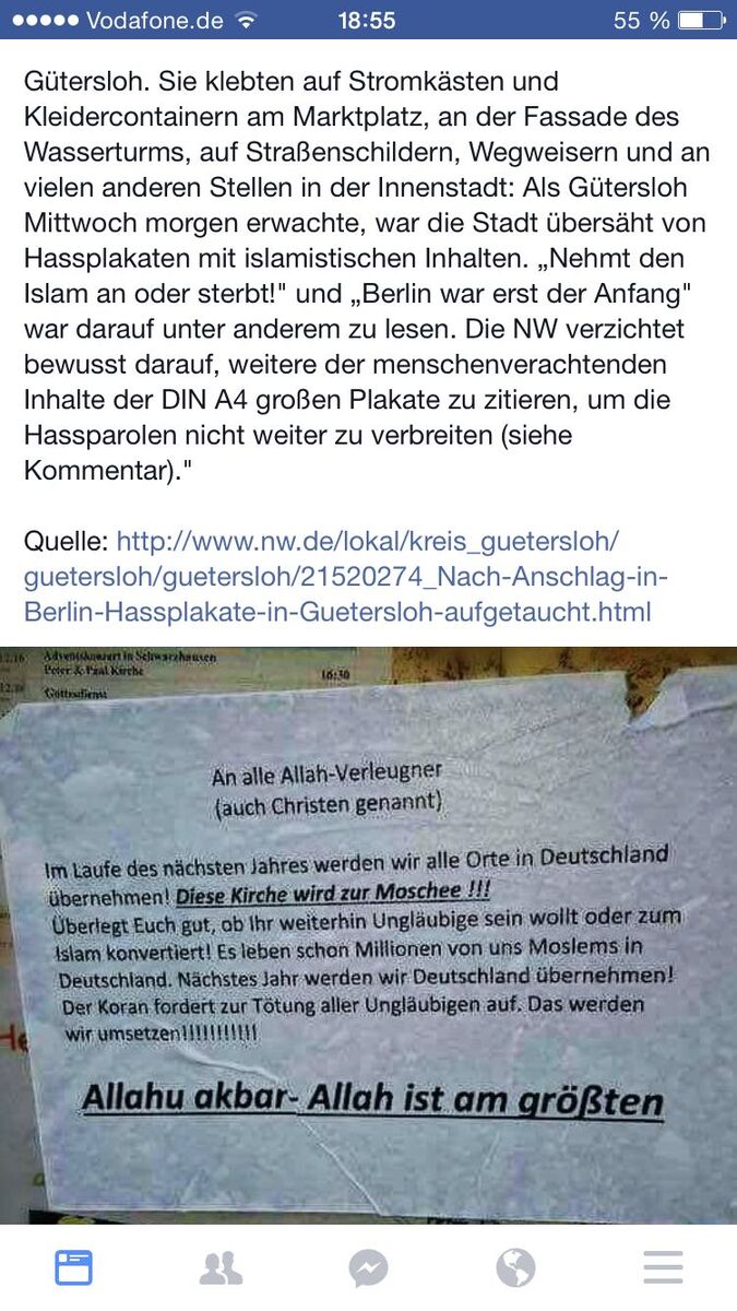 So eine Veröffentlichung allgemeiner Natur ohne eine Gruppierung anzugeben ist m.E. feige ohne Ende. Das schürt doch in diesem Fall auch Hass und Vorurteile gegenüber muslimischen Mitbürgern auf breiter Front. Bloß weil so ein paar feige Säcke nicht dazu stehen, was sie so veröffentlichen. Fehlt nur noch, dass raus kommt, dass die Zettel von rechten Gruppierungen / Parteien ausgehängt wurden, von abgelehnten Asylbewerbern oder von ohnehin schon als straffällig bekannten Ausländern. -