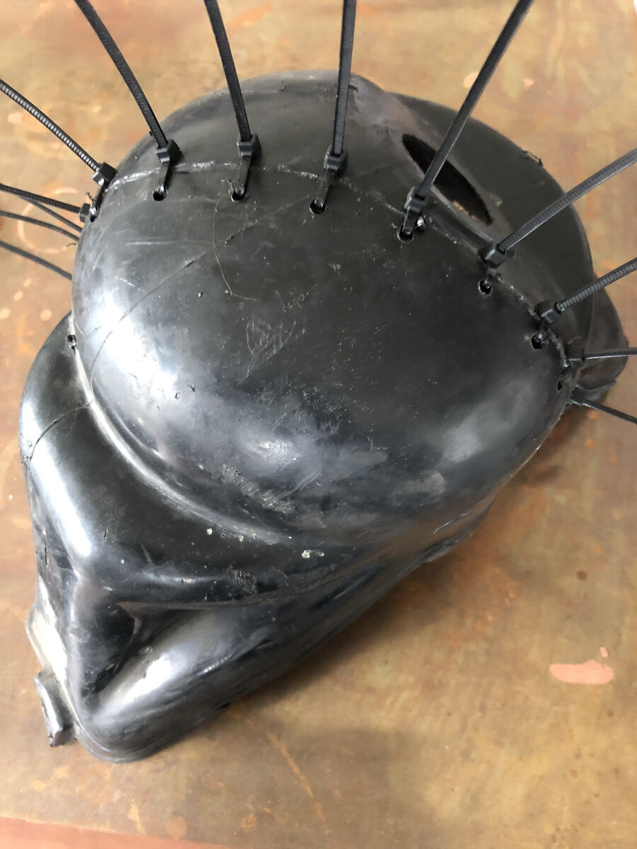 Nachdem ich mir meine altersschwache Zylinderhaube bei der ganzen Aktion geschrottet habe, wurde die russisch geflickt. Die Bohrlöcher für die Kabelbinder muss ich auch noch irgendwie verschließen. Mal auf dem Heimweg irgendwo hitzebeständige Dichtmasse oder so auftreiben.