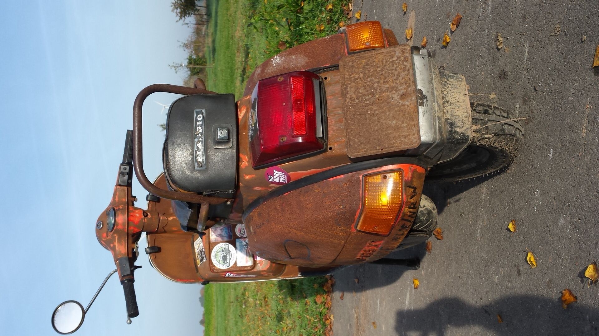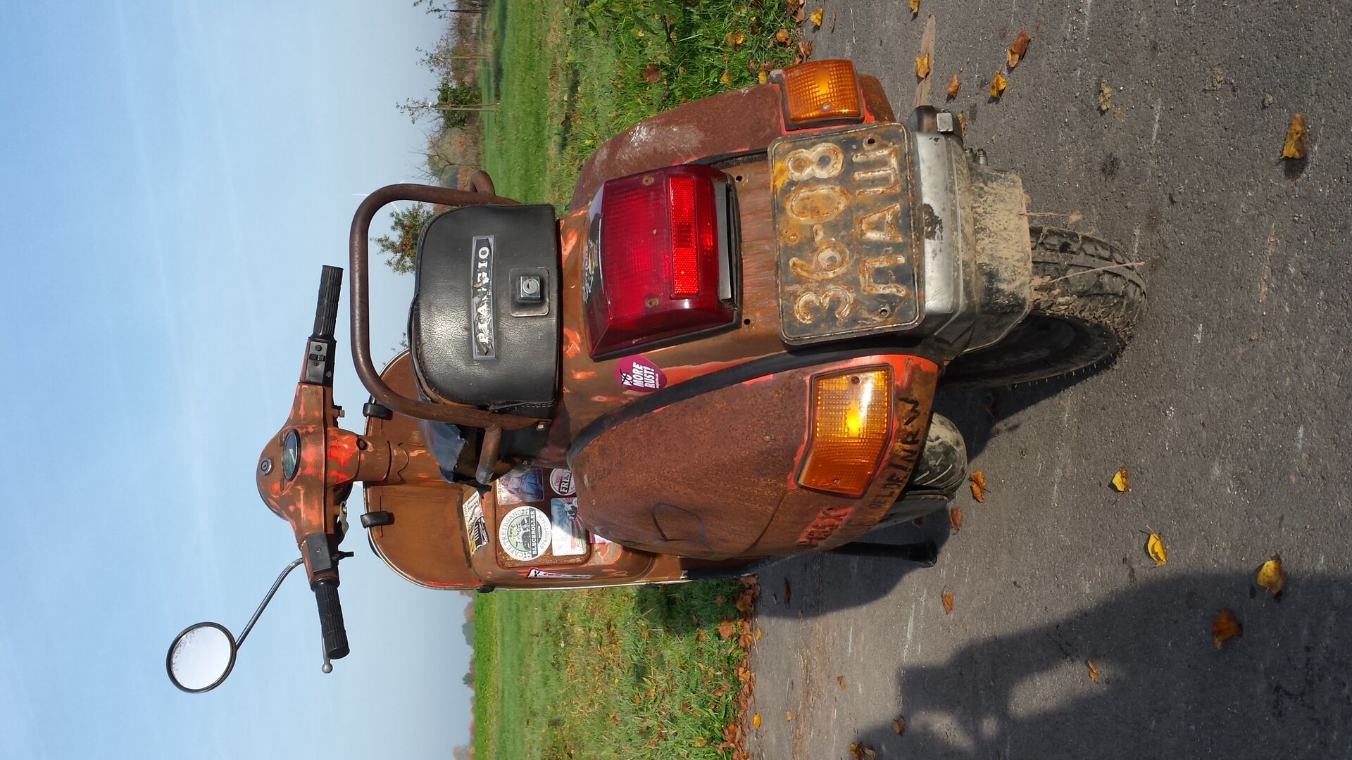 Auf dem Bild steht die zu gut da. Leider teilweise beilackiert: Hinten innere Backe, Rechte Backe außen leicht, vorne Beinschild höhe Gepäckträgeraufnahme, Vergaserinnenraum, Kotflügel vorne links. Ich tippe auf 80 % olack. Aber immerhin ist Rost überhaupt kein Thema...