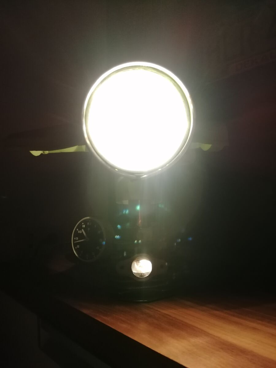Habe Zuhause schon länger nen kaputten Rundlicht Lenker liegen den ich zu ner Lampe umbauen wollte. Habe aber nie ne Idee zum Fuß gehabt. Eben ein Rohr von nen Pavillon in die Finger bekommen. Passt in den Lenker rein. Dann mal den ganzen schrott im meiner Werkstatt nach nen Fuß durchsucht. Ein geschrotteter 75er DR isses geworden. Rohr passend geflext und nen Loch rein gebohrt. Ne Motorschraube rein die alles hält,Lenker drauf,feddich. Nachher mal Zuhause schauen wie oder was ich da an Licht rein bastel