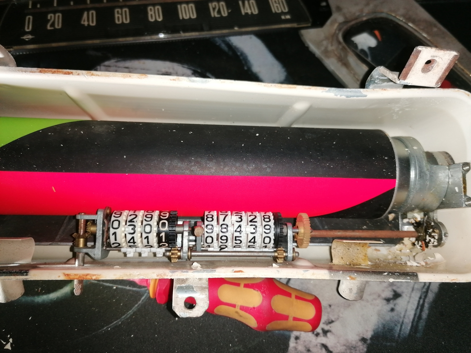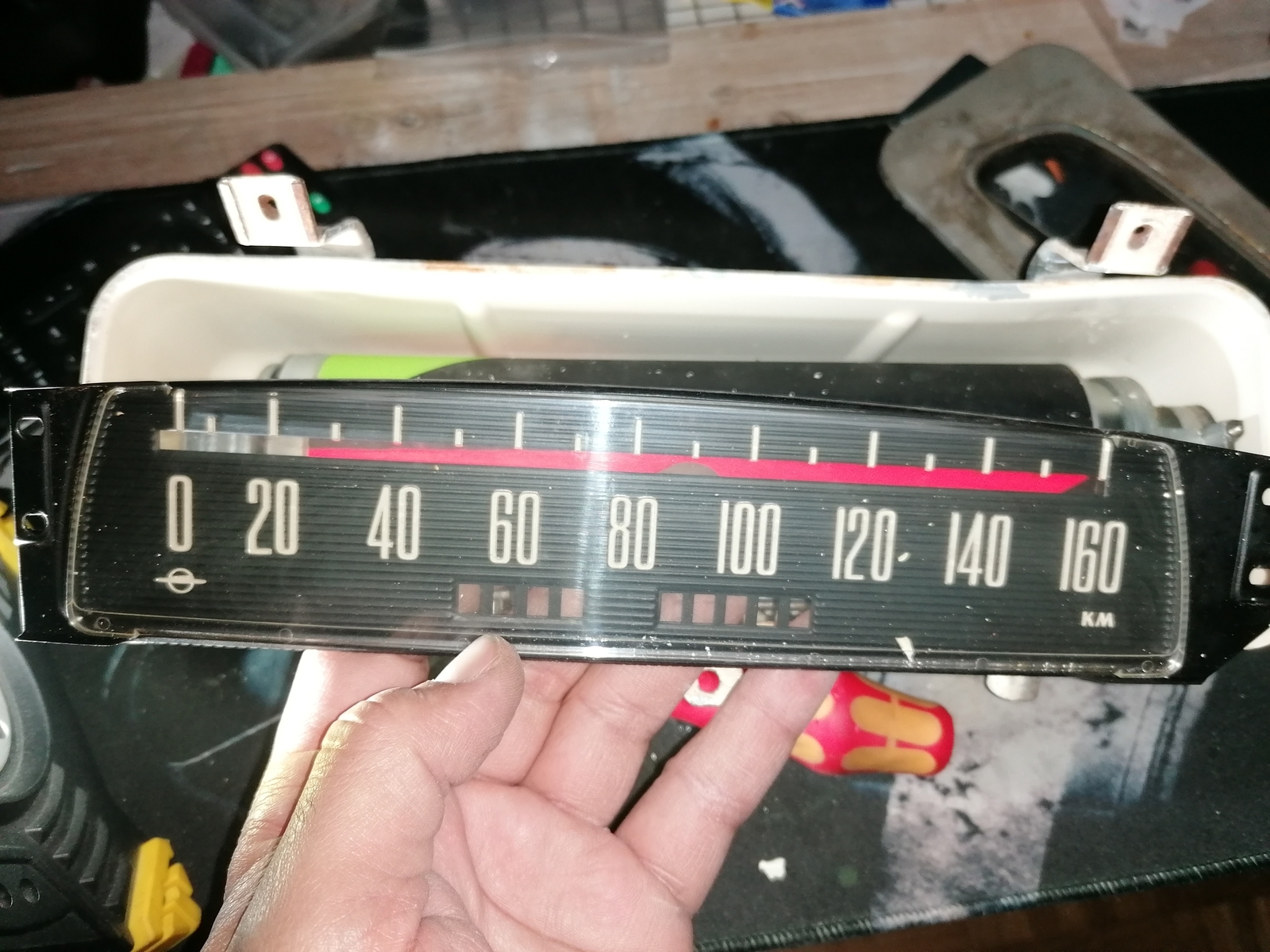 Habe heute einige Opel Kapitän Teile bekommen. Auch ein Tacho war dabei. Da war die Geschwindigkeitsrolle übergesprungen. Das ist wieder repariert. Jetzt noch den Rest raus schrauben, ist mit 4 schrauben von hinten befestigt, und reinigen und ölen. Der Lack indrin ist abgeplatzt und klebt überall dran. Wasser war auch mal drin. Dann sollte der wieder funzen. Mit all den Amaturen die ich mittlerweile habe muss ich mir mal ein Brett machen wo die alle eingelassen sind und beleuchtet werden