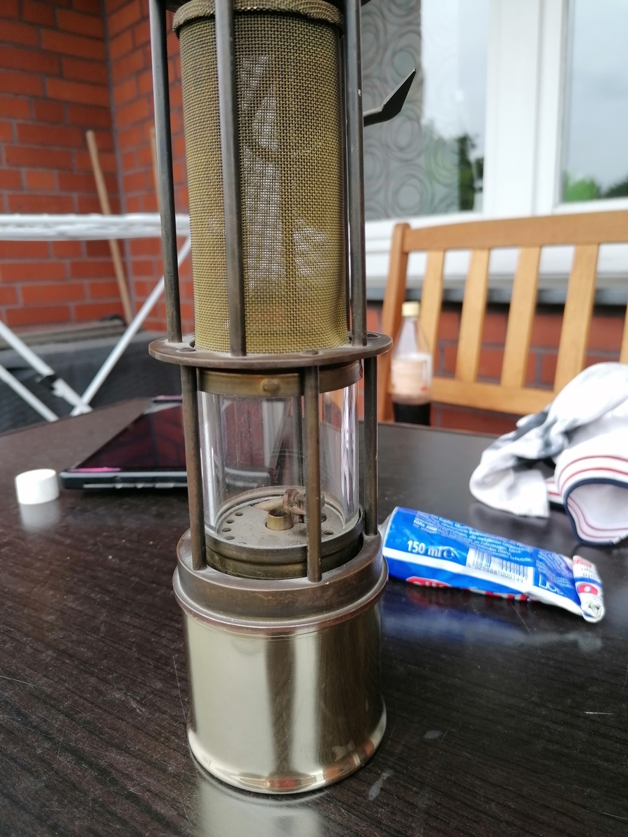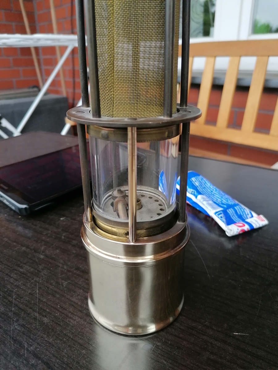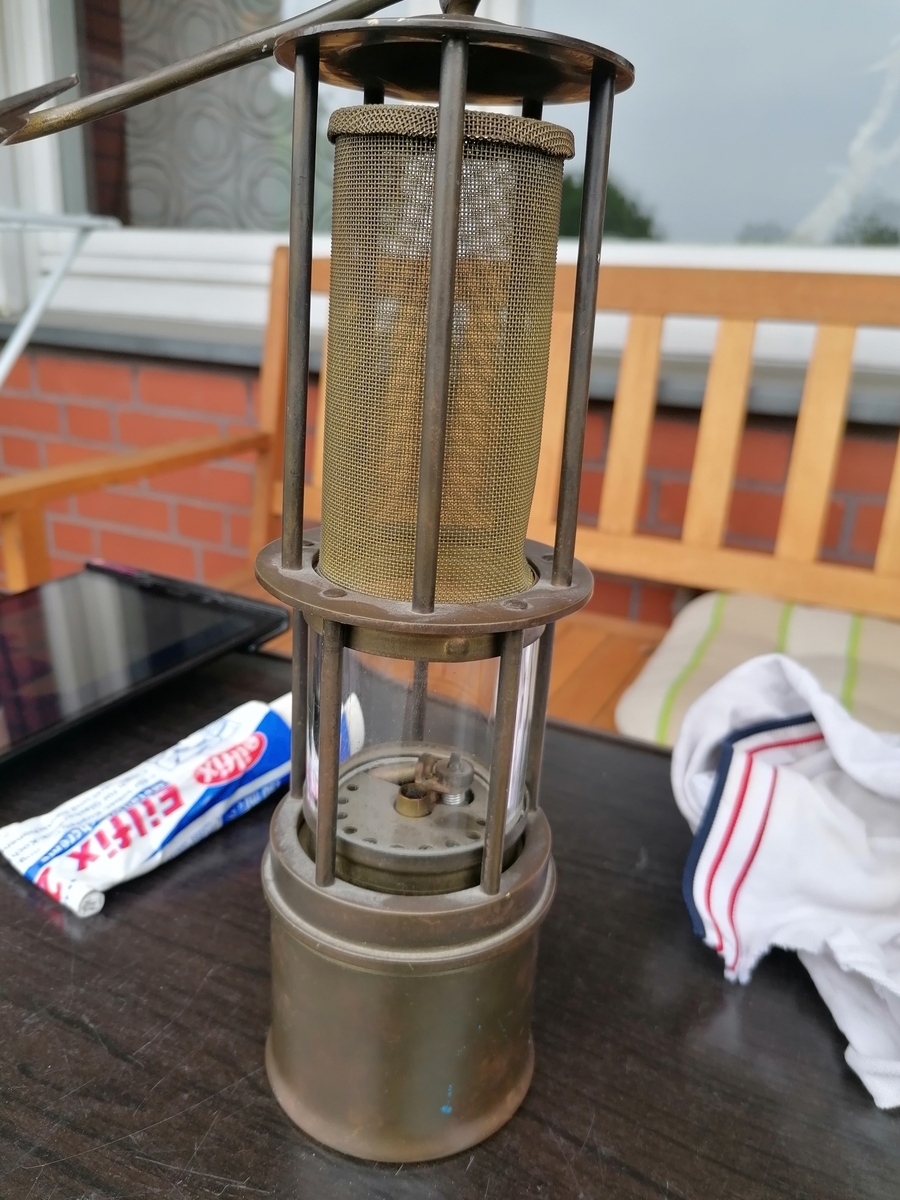 Die Drahtgewebe oben drin sind hier in Oelde hergestellt worden. In meiner fehlt das innere Gewebe. Sind eigentlich immer 2 drin. Damit es keine Gasexplosion gibt. Die dienen als Puffer. Ist ein interessanter Aufbau von so einer Lampe.