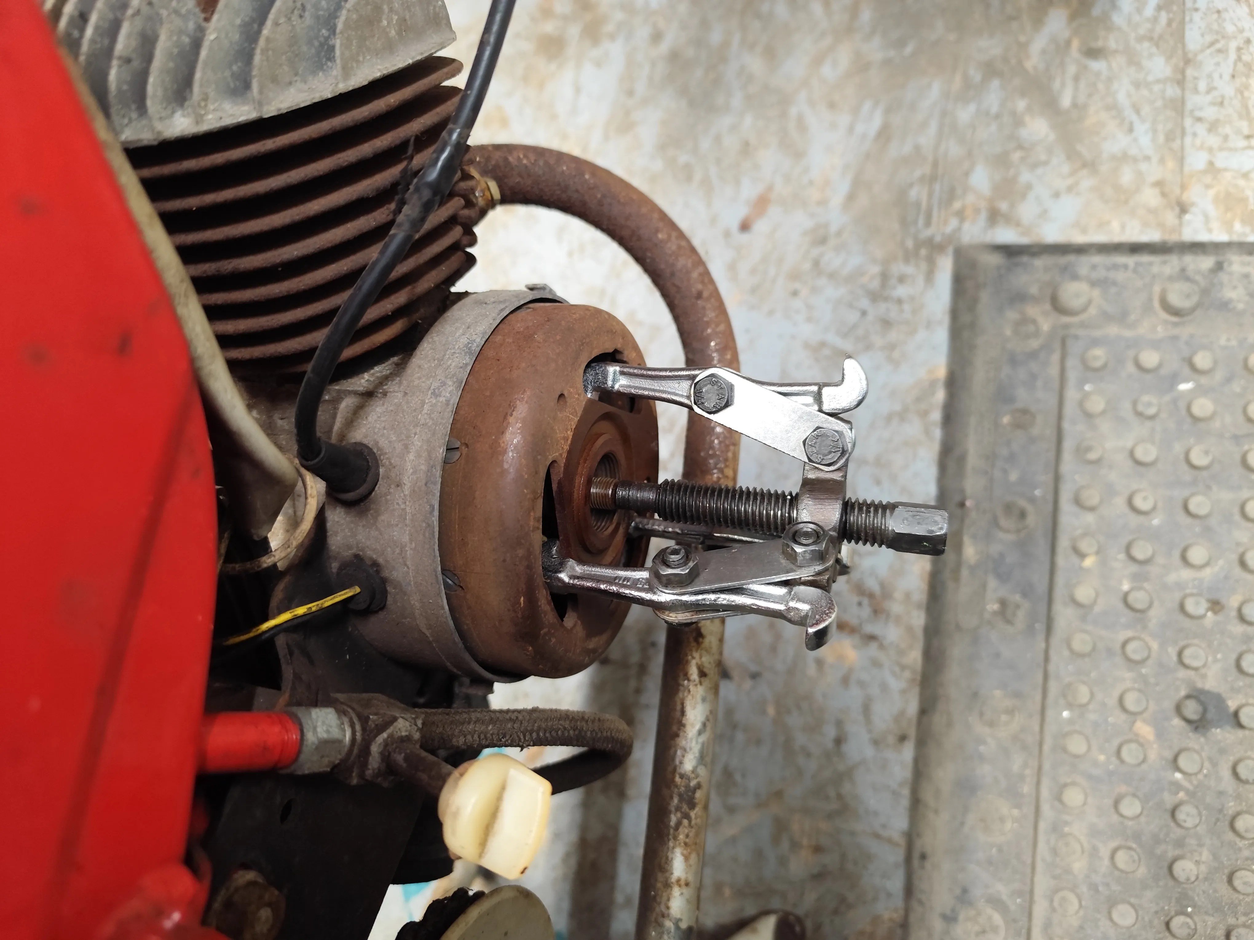 Passenden Polaradabzieher habe ich nicht. Habe den dreiarmigen drauf angesetzt. Der steht jetzt derbe unter Spannung und ich hoffe das der Rostlöser sich mit den dreiarmigen zusammen einen reinorgelt und abstürzen ![]()
