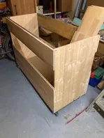 Hatte mir vor Unzeiten einen Schrank auf Rädern gebaut, in dem ich alte Kartons und Glump gelagert habe. Beim Kellerräumen kam der wieder zu Ehren und hat nun halboffene Seitenwände. Damit kann ich mein Holzlager von statisch (auf Wandhaltern) zu dynamisch (ab in den Wagen) umgestalten. Während des Umschichtens bekommt der Holzwagen dann bestimmt noch Trennwände.
