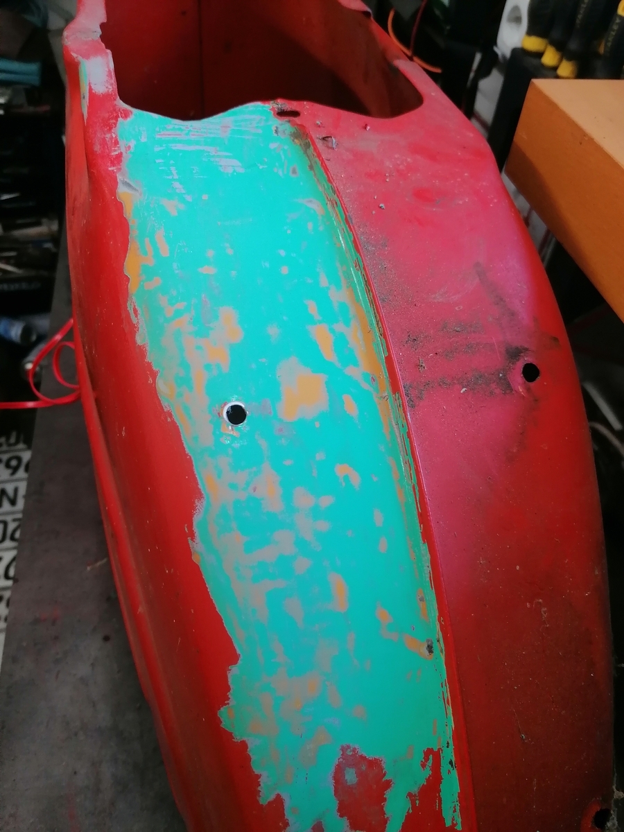 Der originale Lack ist ein beige/gelb/braunwasauchimmer. Eigentlich ne geile Farbe. Bis ich eben den Abbeizer aufgetragen habe und unter dem rot die Grundierung zum Vorschein kam. Jetzt wird's ne Grundierung/O Lack Kiste werden