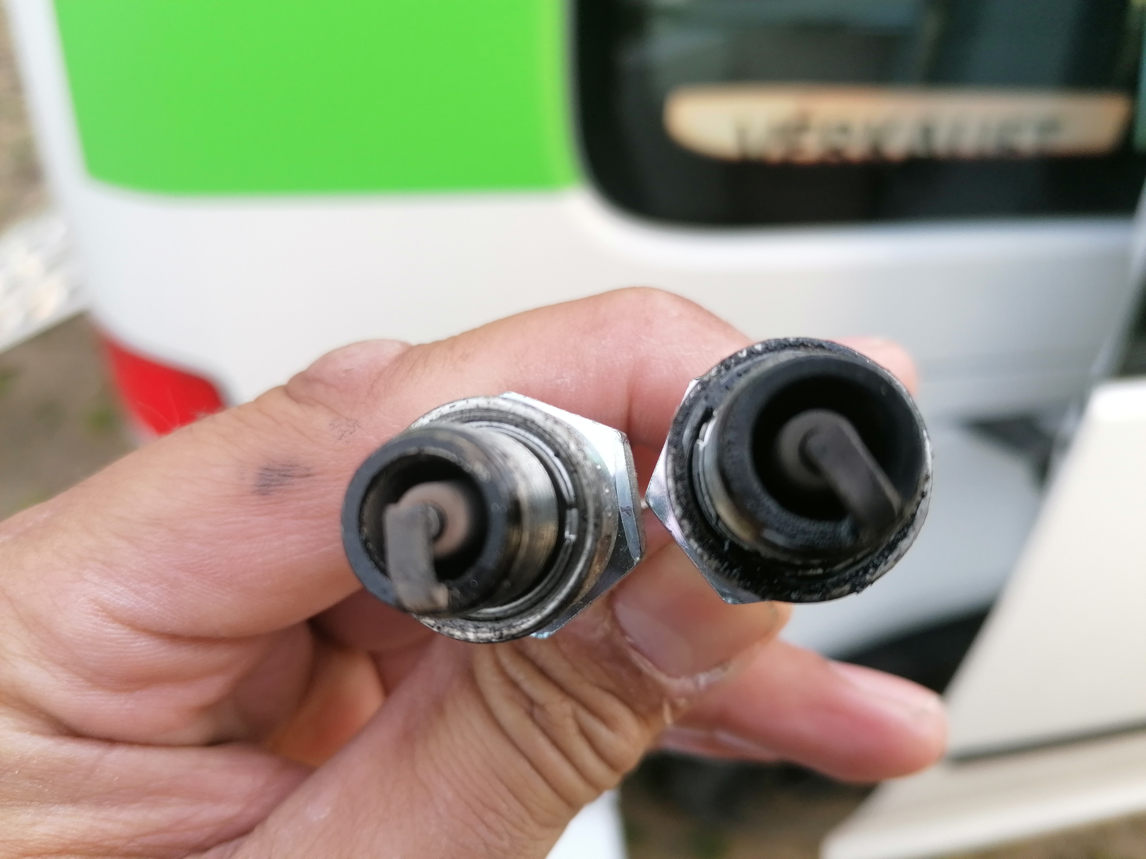 Feder hinter der Gemischeinstellschraube ist gebrochen. Die Schraube hat sich 5.5umdrehungen rausgedreht. Wieder 2 Umdrehungen raus gedreht und weiter. Nach guten 5 km habe ich mir gedacht drehste mal ne andere Kerze rein. Da war sie nicht mehr schneeweiß sondern grau. Dann ca 70-80km mit der anderen Kerze weiter. Die ist jetzt schwatt mit ein ganz wenig grau/braun drin.