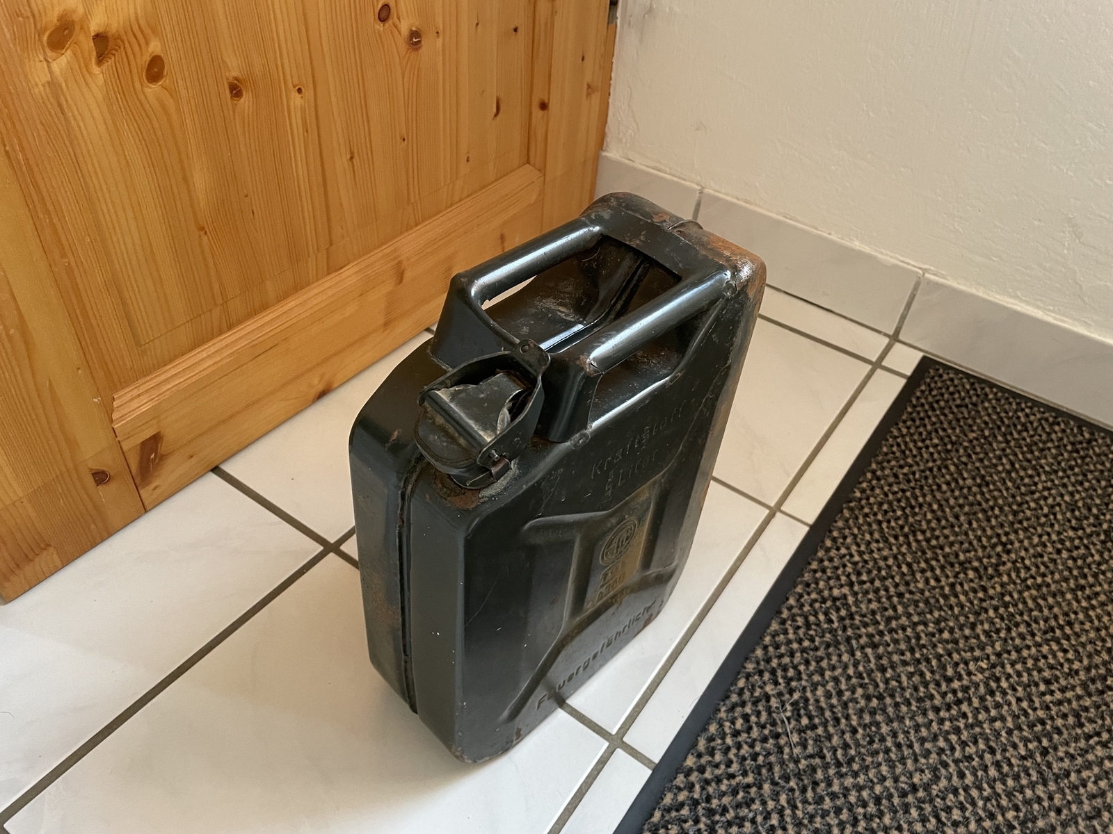 • Ich habe der Vespa versprochen, wenn sie wieder gut läuft und nicht zickt, bekommt sie einen Frontgepäckträger mit 5L-Kanister vom SC. Allerdings erschienen mir die 40€ nur für den Kanister schon happig. Ich habe dann einen im ibäi geschossen...mit sehr schöner Patina für 7€