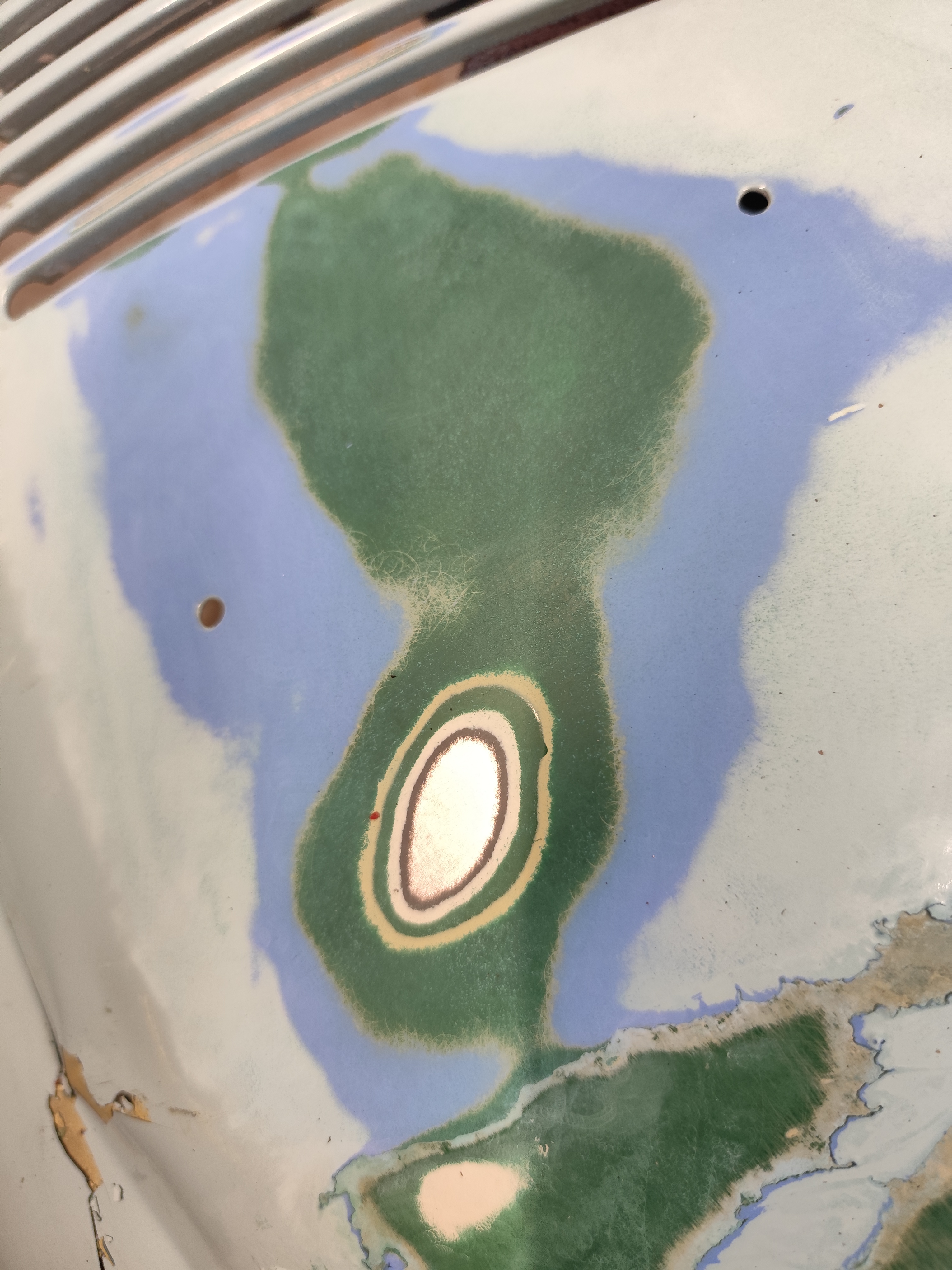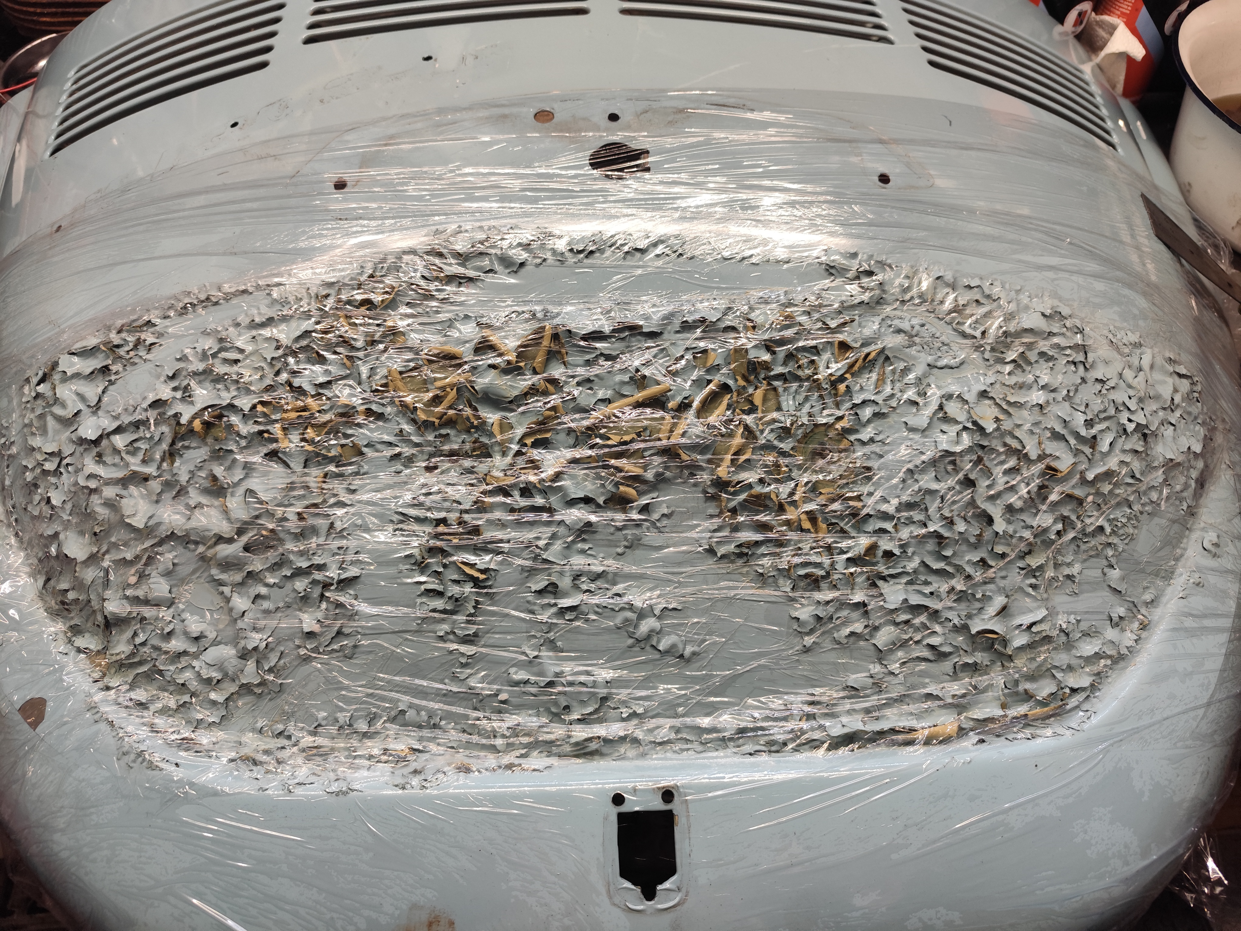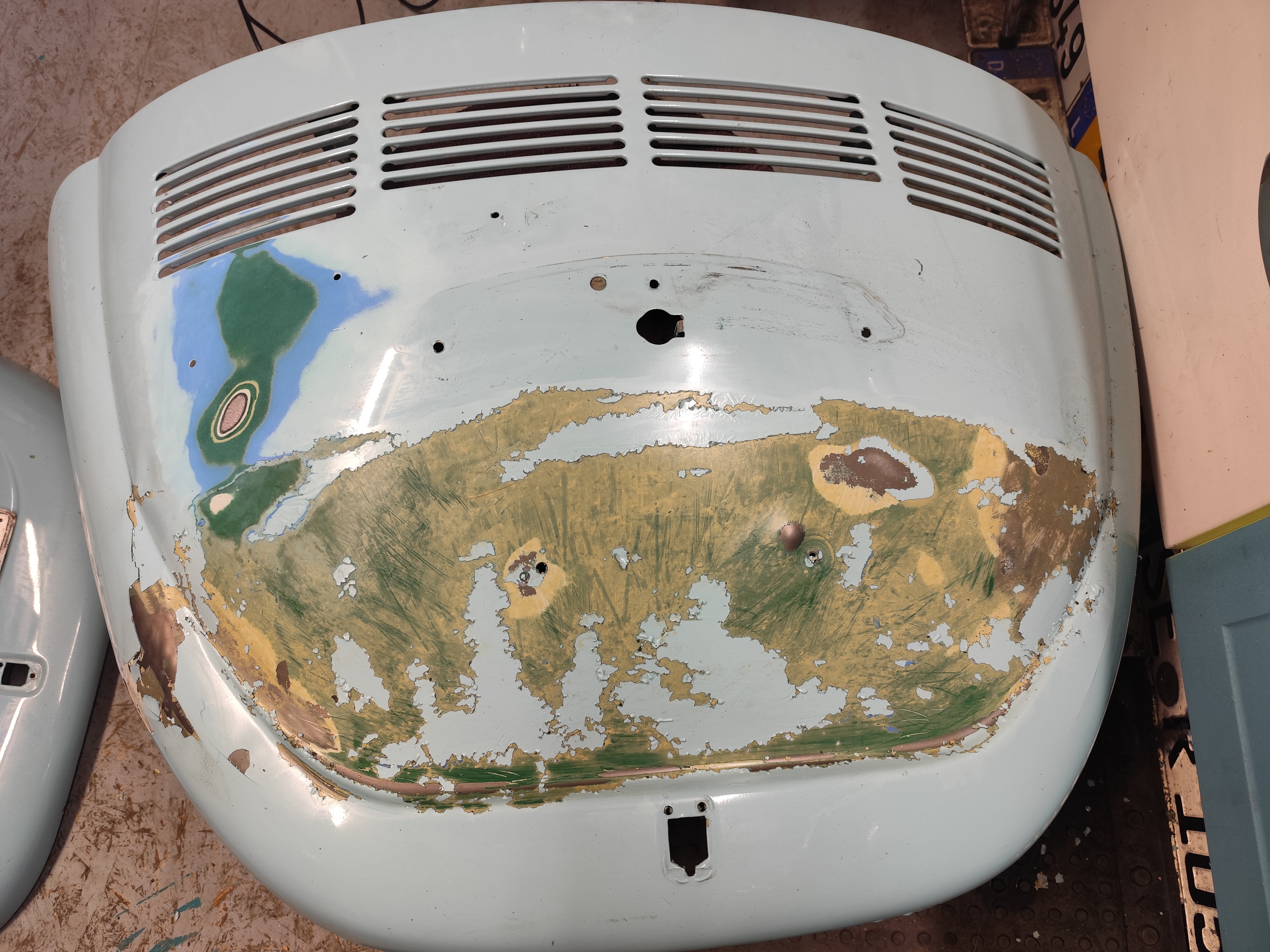 1302 konnte man noch lesen auf der Haube. Die hatte ja auch ne derbe Delle gehabt. So gut es geht rausgedengelt. Also kein guter Zustand. Von daher habe ich da weniger Schmerzen die blank zu schleifen.
