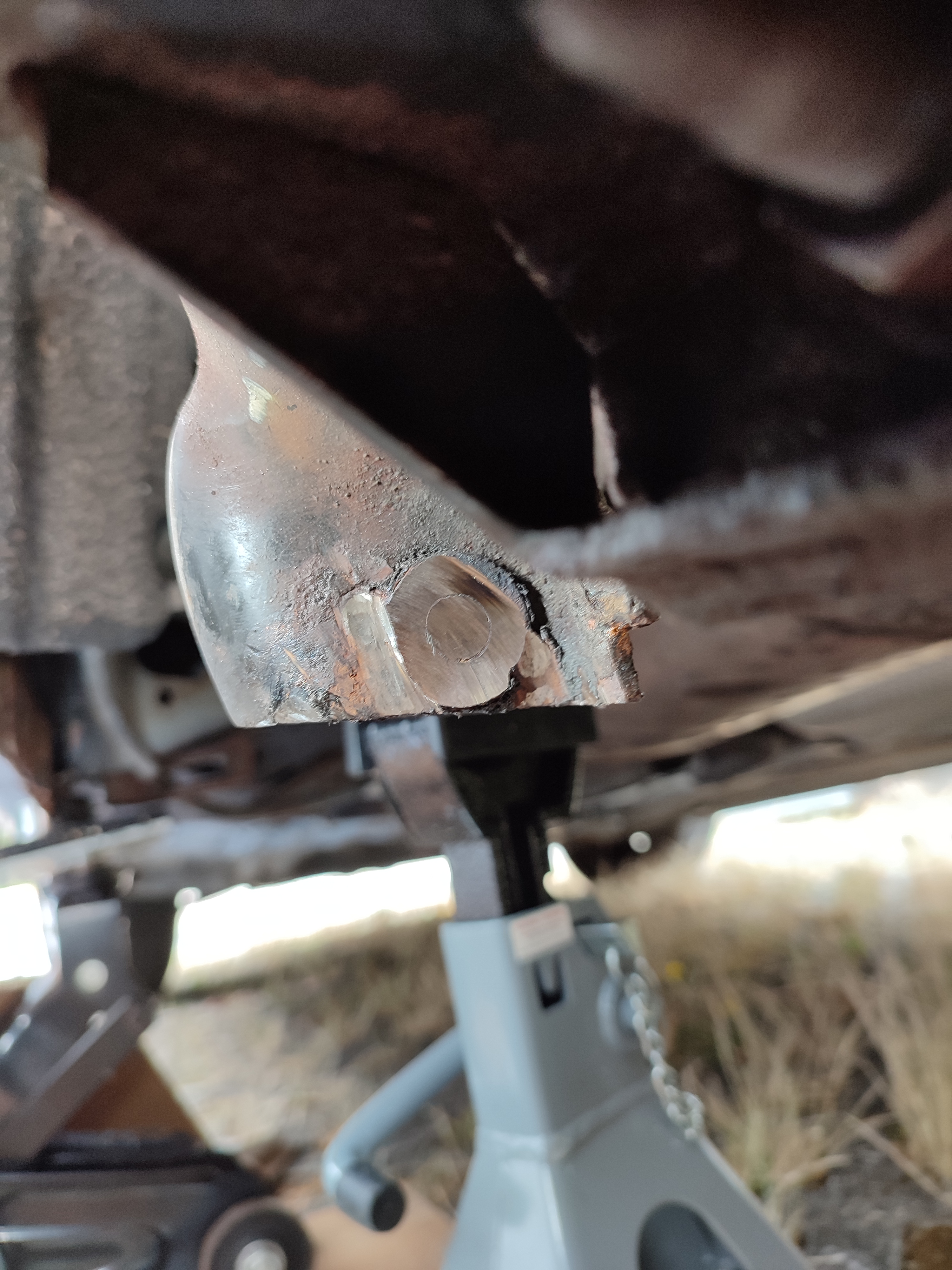• Hab von einem nahen Verwandten eine Schraube an der Zugstrebe abgerissen...davor meinte ich noch die Welt gehört den Mutigen...Mutter an der Rückseite aufs Karosserieblech geschweißt...heute Mutter knapp mit Winkelschleifer und Sabelsäge abgeschnitten...dann die Buchse der Zugstrebe mit der Säbelzahnsäge durchtrennt