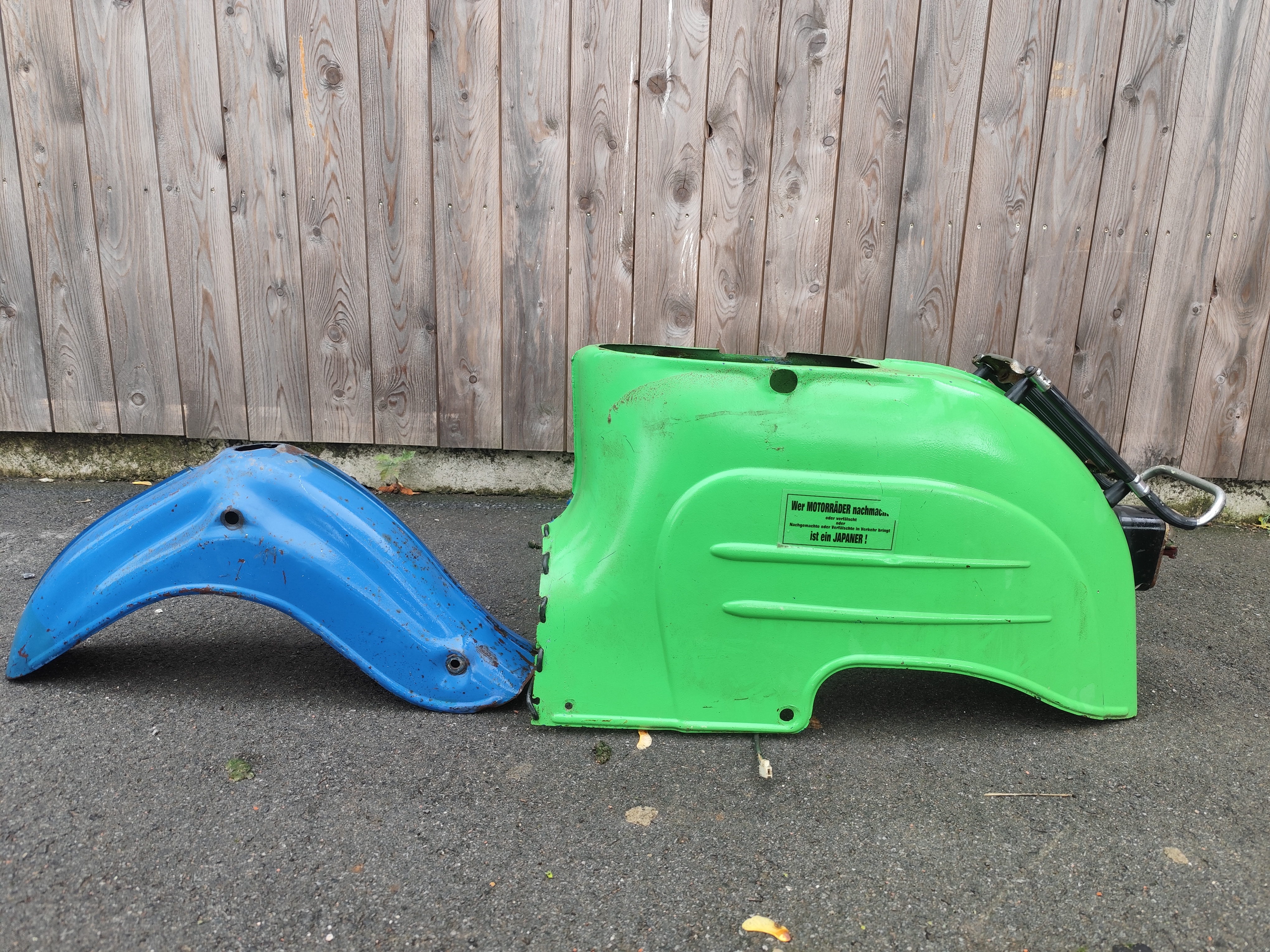 So bleibt die Farbe nicht. Der Kotflügel zeigt den orginalen Lack. Der ist aus mein Lager. Die neue Farbe wird knallen. Alles Low Budget versteht sich. Ein Teil der Farbe habe ich schon.