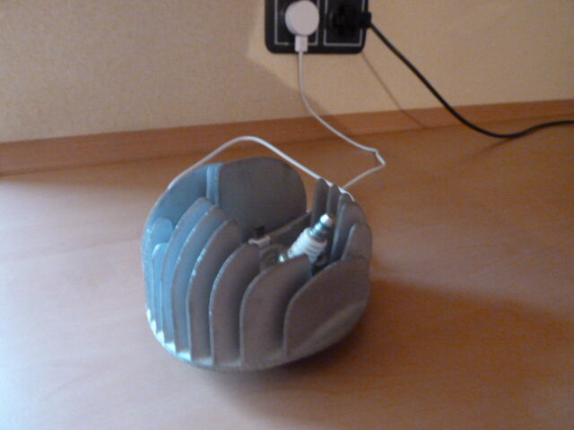 Ein Alter Zylinderkopf von ner V50 war die Idee ..etwas umgearbeitet mit Standfüssen..Kabel anschluss..Zündkerzte (Deko