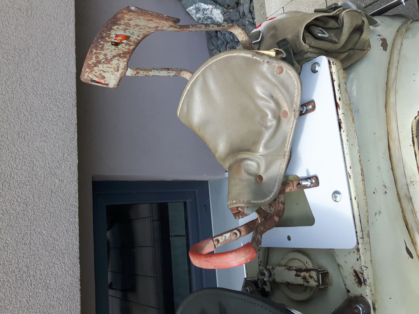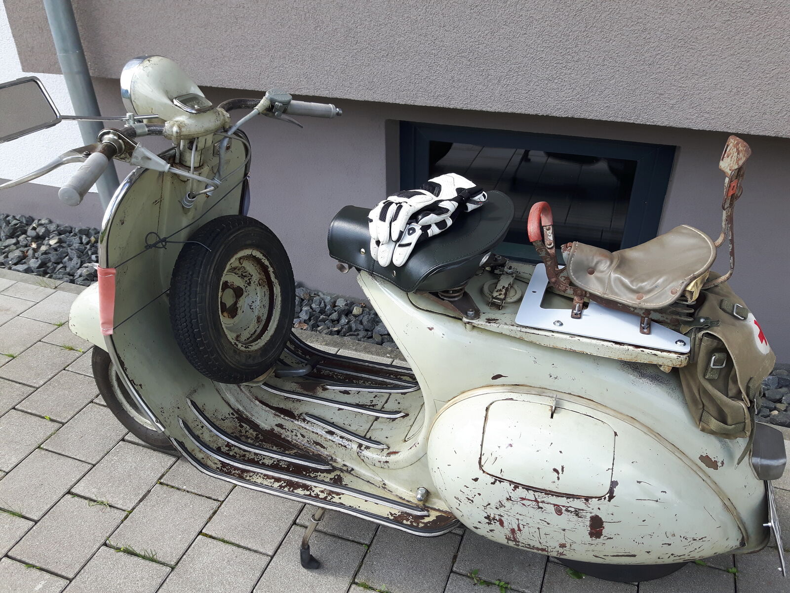 Vespa im Wohnzimmer auf alten Parkettboden ohne Unterlage.