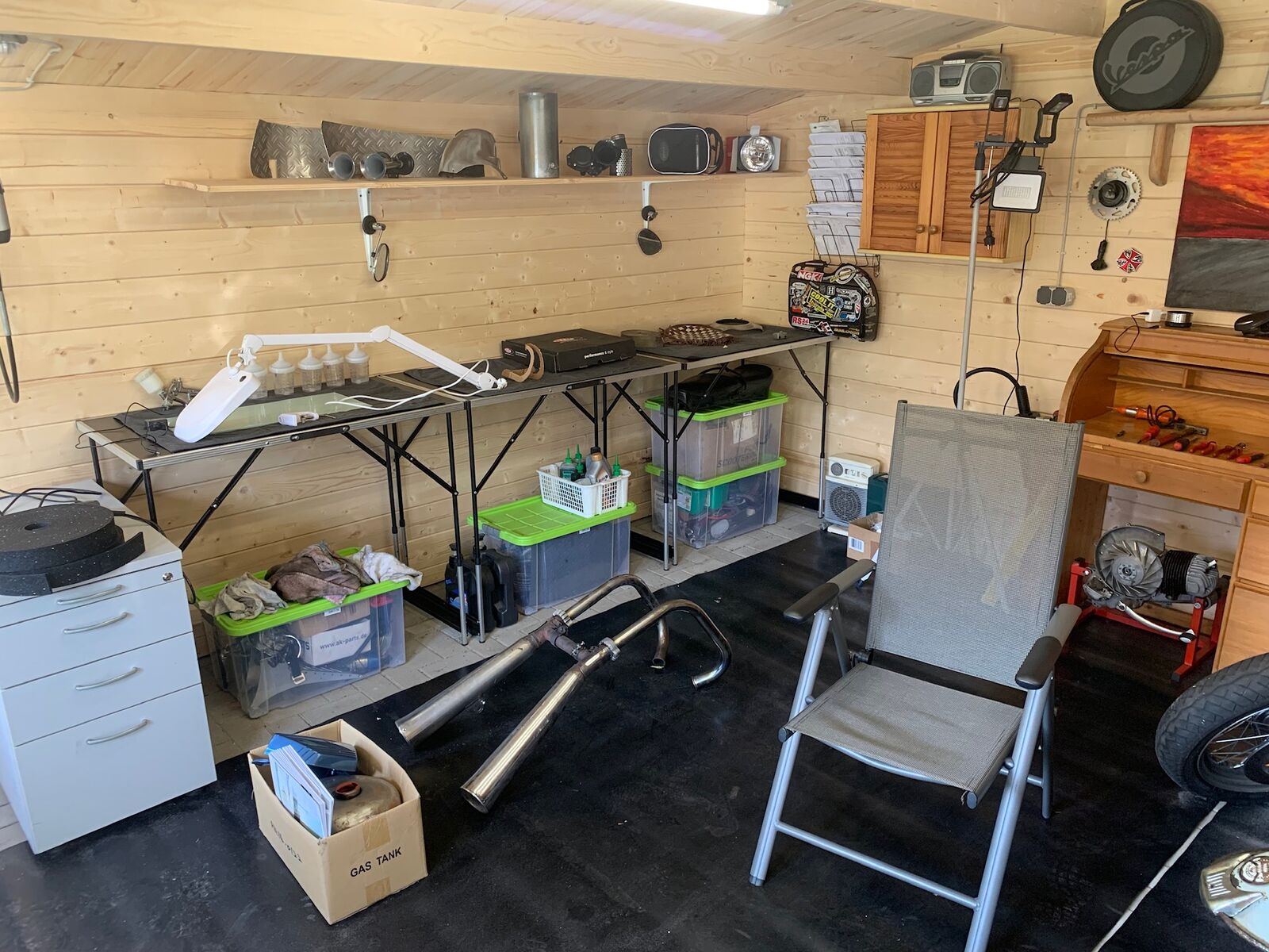 Dickarsch 130/70/10 hinten 100/80/10 vorn, Jep Auspuffanlage ist Kawa und die ersten drei Diamondplate Riffelblechplatten für den Fußboden sind angekommen, hab aber auch schon über Bürostuhl Unterlagen ala 1965 nachgedacht, hab ich aber verworfen...