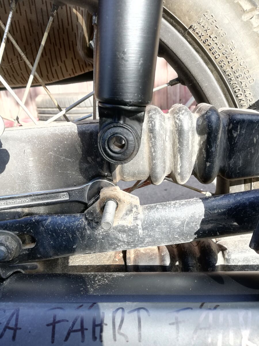 Da die Farbe am Benz erst trocknen musste habe ich den Auspuff von der Simson mal schwatt gelackt und zur Probe andere Dämpfer hinten in die S 51 geschraubt. Sind die vorderen Dämpfer einer Simson Schwalbe. Leider sind die zu kurz und zu weich. Das Rad lag voll im Kotflügel. (Sieht aber geil aus) Und das liegt nicht alleine daran das ich zu fett bin. Kumpel saß auch drauf. Und der wiegt nur die Hälfte von mir.