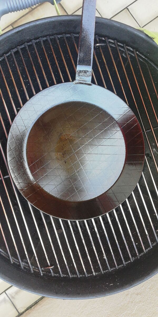 Grill an,Stahlpfanne drauf,einbrennen. Mit Leinöl. Geht am schnellsten und effektivsten wurde mir gesagt. Nach 3.5 Std mit mehrmaligen einreiben sollte das gut sein. Deckel war auch drauf ,aufem Grill