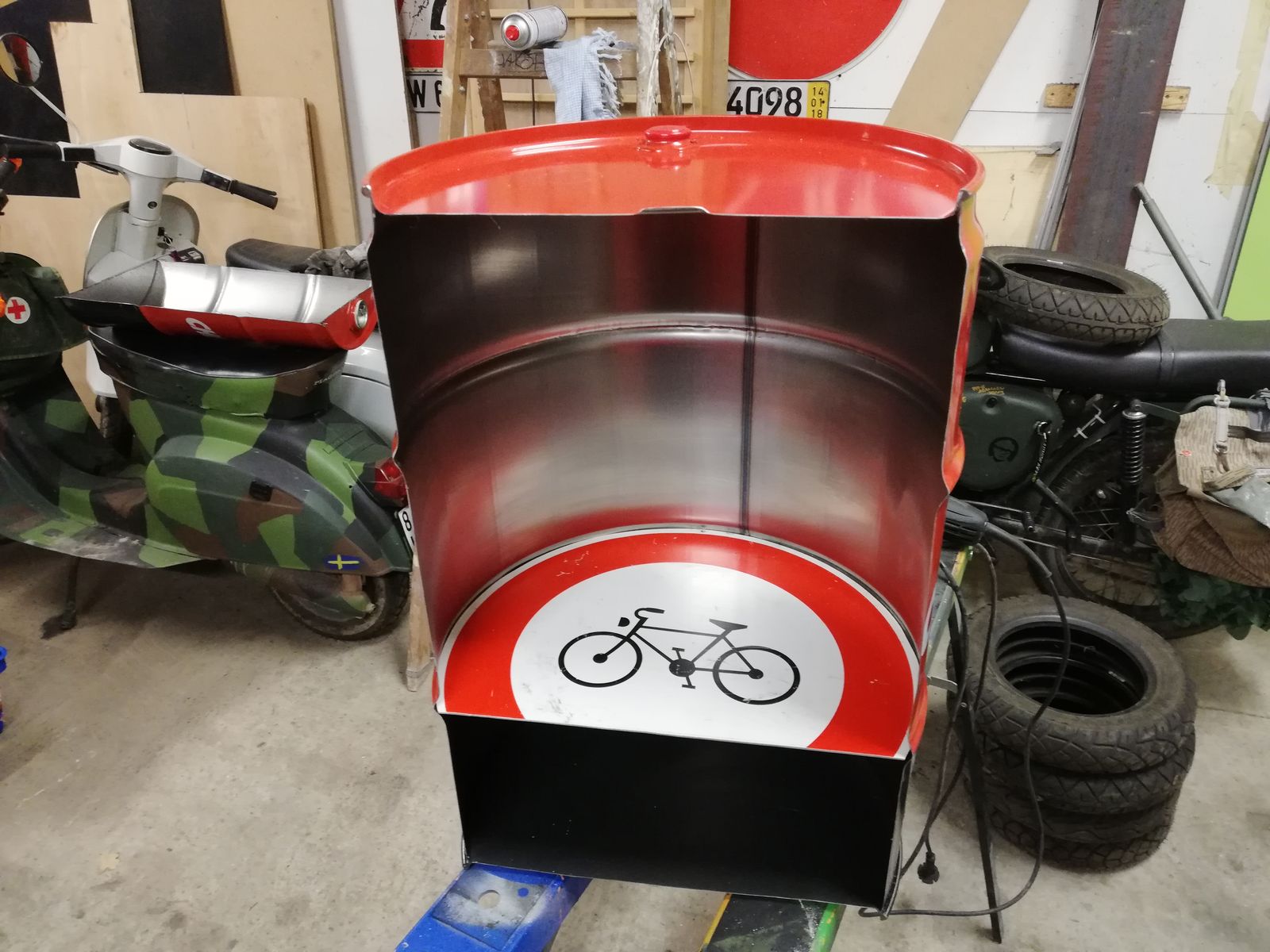 Altes 60L Ölfaß aufgetrennt und als Boden ein kleines Schild aus ner Fahrschule (Praktische Mofaprüfung z.b) passend gesägt welches als Boden dient.