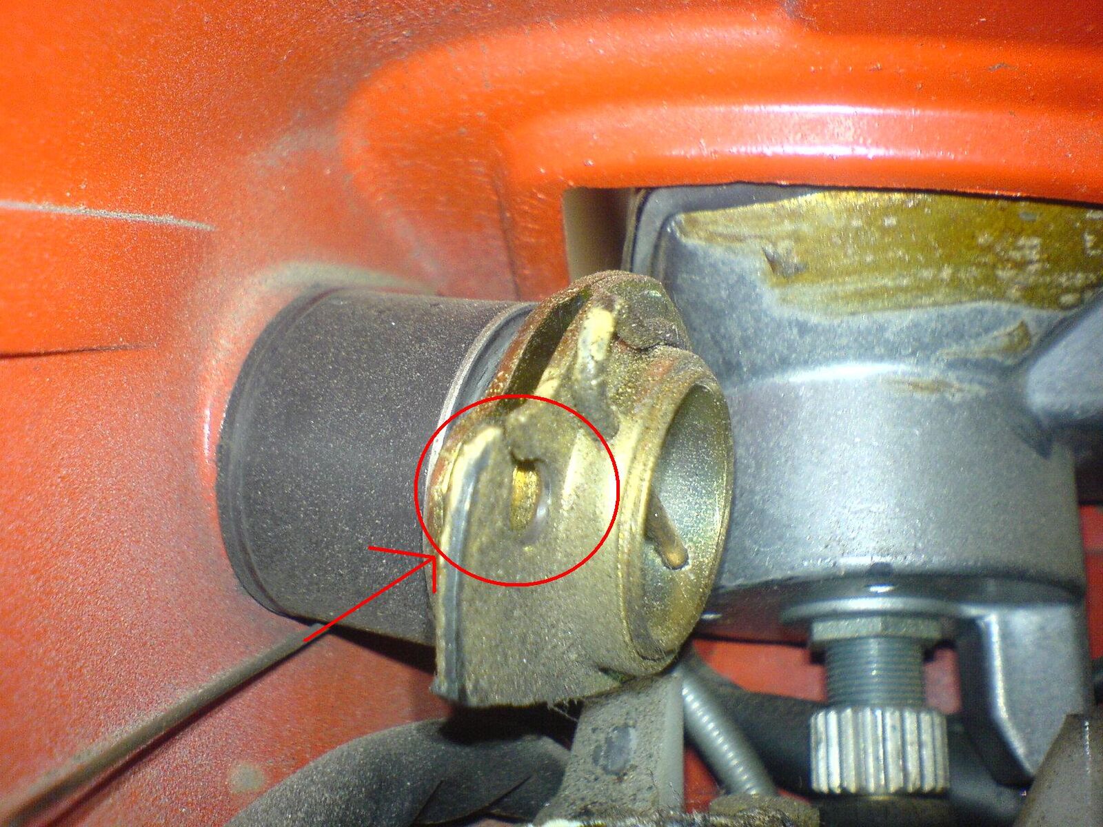 Ja da wo du markiert hast ist der Anschlag der Zughülle, also kommt da auch der Draht raus. Du wirst den Draht von oben nach unten durchschieben und dann den Endkopf einfach in das Loch vom Gasgriff einhängen (siehe Foto). Ist eigentlich eine relativ logische Geschichte. Wenn du dann am Griff drehst, wird der Zug quasi über die Führung nach oben gezogen.