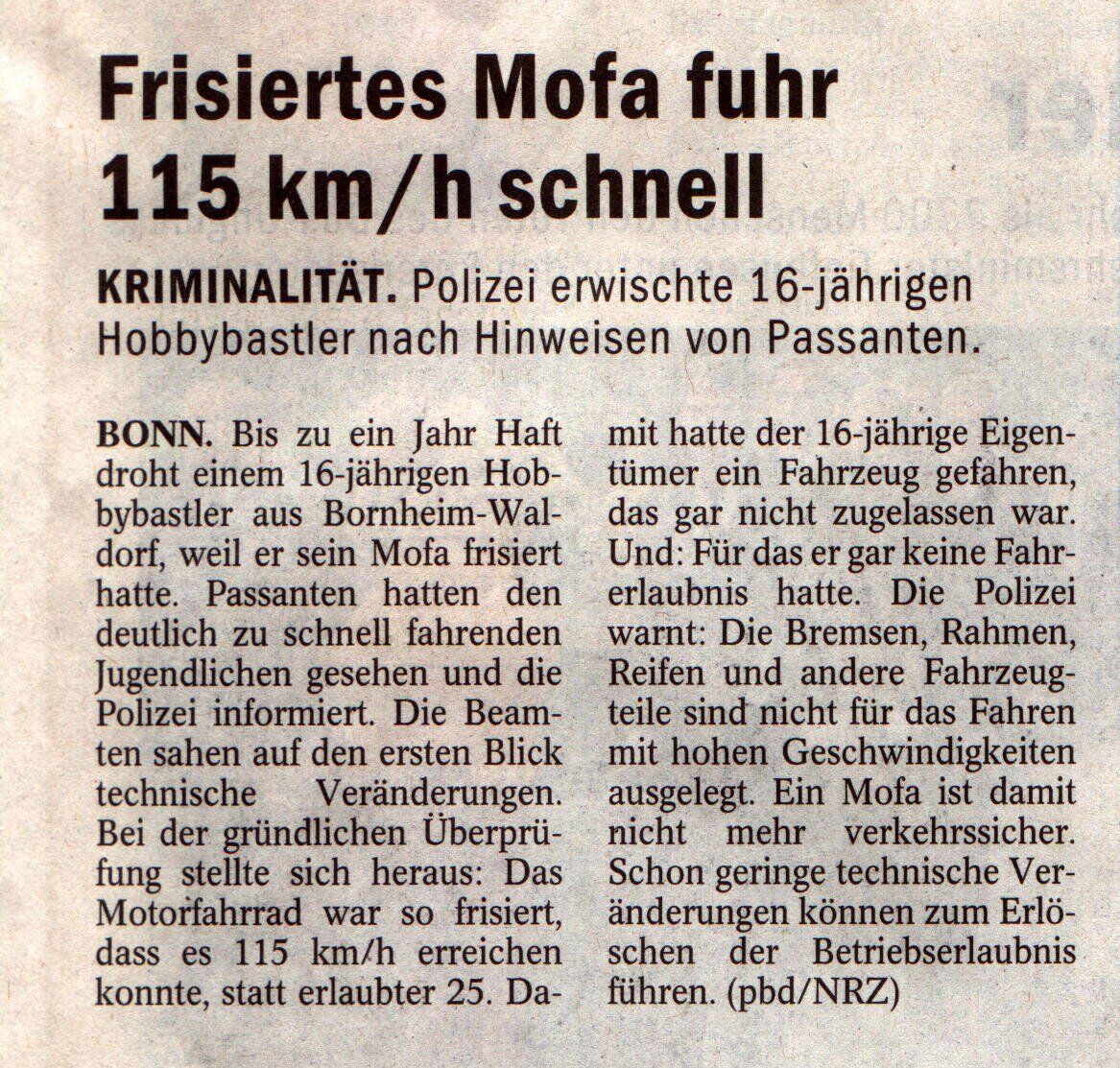 Ich geb ja zu, dass 115 bei nem Mofa ziemlich heftig sind und ich denke auch dass er ordentlich was aufs Dach bekommt. Aber Haftsrafe???