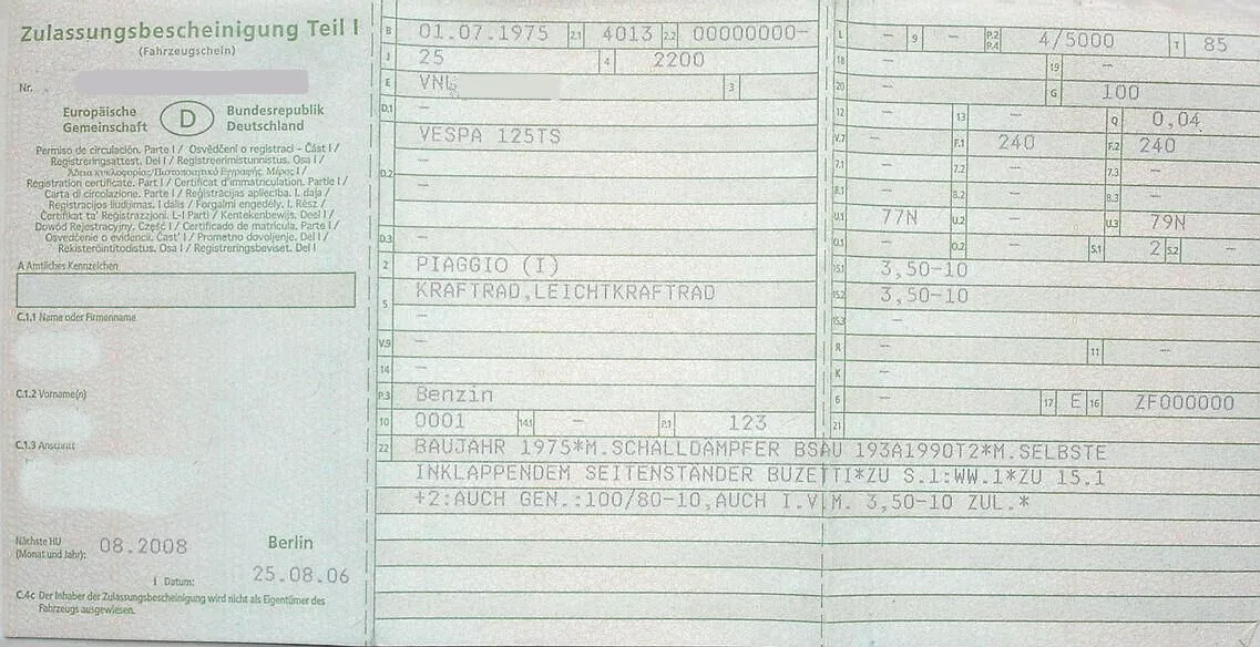 Die englische papiere sind schon in mein name, geht leichter da als heir, aber ich möchte natürlich deutsche papiere/fahrzeugsschein haben. Wenn jemand mir ein kopie von VNL3T papiere schicken könnte... wäre sehr nett. Ich vermüte auch, dass es ein voll 125cc fahezeug ist und nicht ein leichtkraft blah wir PV?