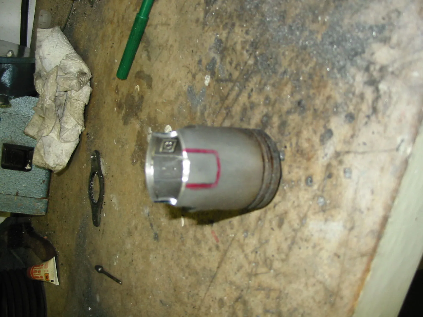 Zylinder an den Kolben angepasst. Das Kolbenfenster war ja größer als der Überströmer im Zylinder. Ausserdem Kolbenfenster für den Boostport ausgeschnitten und Auslass trapezförmig vergrößert. Das wars für heute will mich jetzt auf die couch schmeißen.