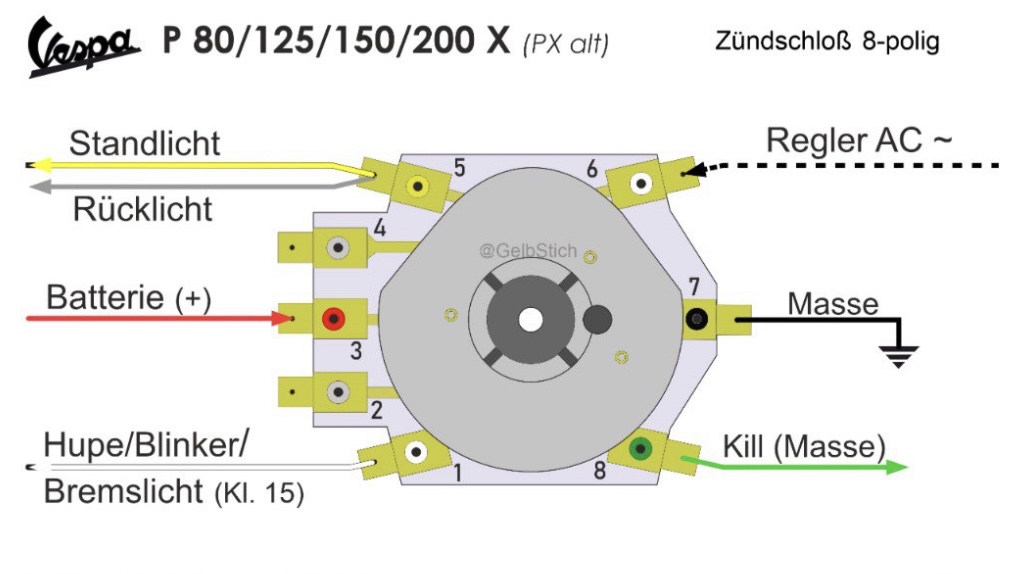 Bei der PX vom Kumpel ist Pin 5 aber nicht grau grau, sondern grau gelb (zum Standlicht) und Pin 1 grau grau (Hupe und Bremslicht), das ist ne 82er PX 80 und die sollte identisch zum Problemfall sein.