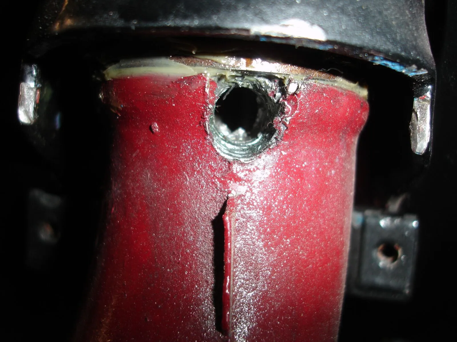 Die Seitenbegrenzung wurde professionell von dem Vorbesitzer gelöst indem er ein M8 Gewinde in das Lenkrohr gebohrt hat und somt eine Schraube an das halb ausgeflexte Lagerabdeckung stößt ![]()