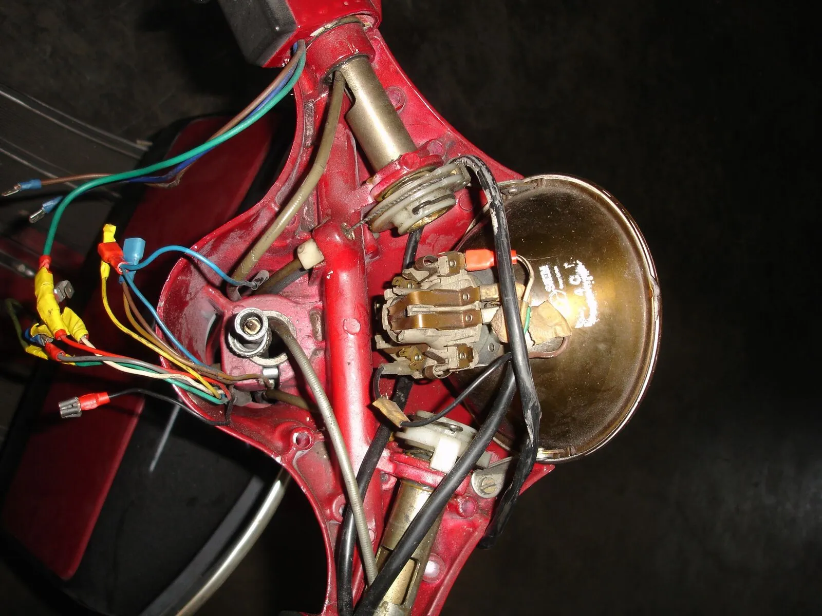 Blinker, Licht und Zündschloss gehen momentan nicht. Das grüne Kabel ist bereits an das Zündschloss der PX Abdeckung angebracht und das Zündschloss unten anscheinend tot gelegt.