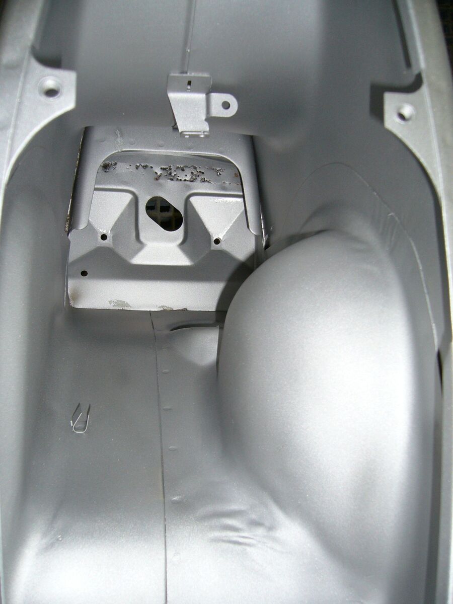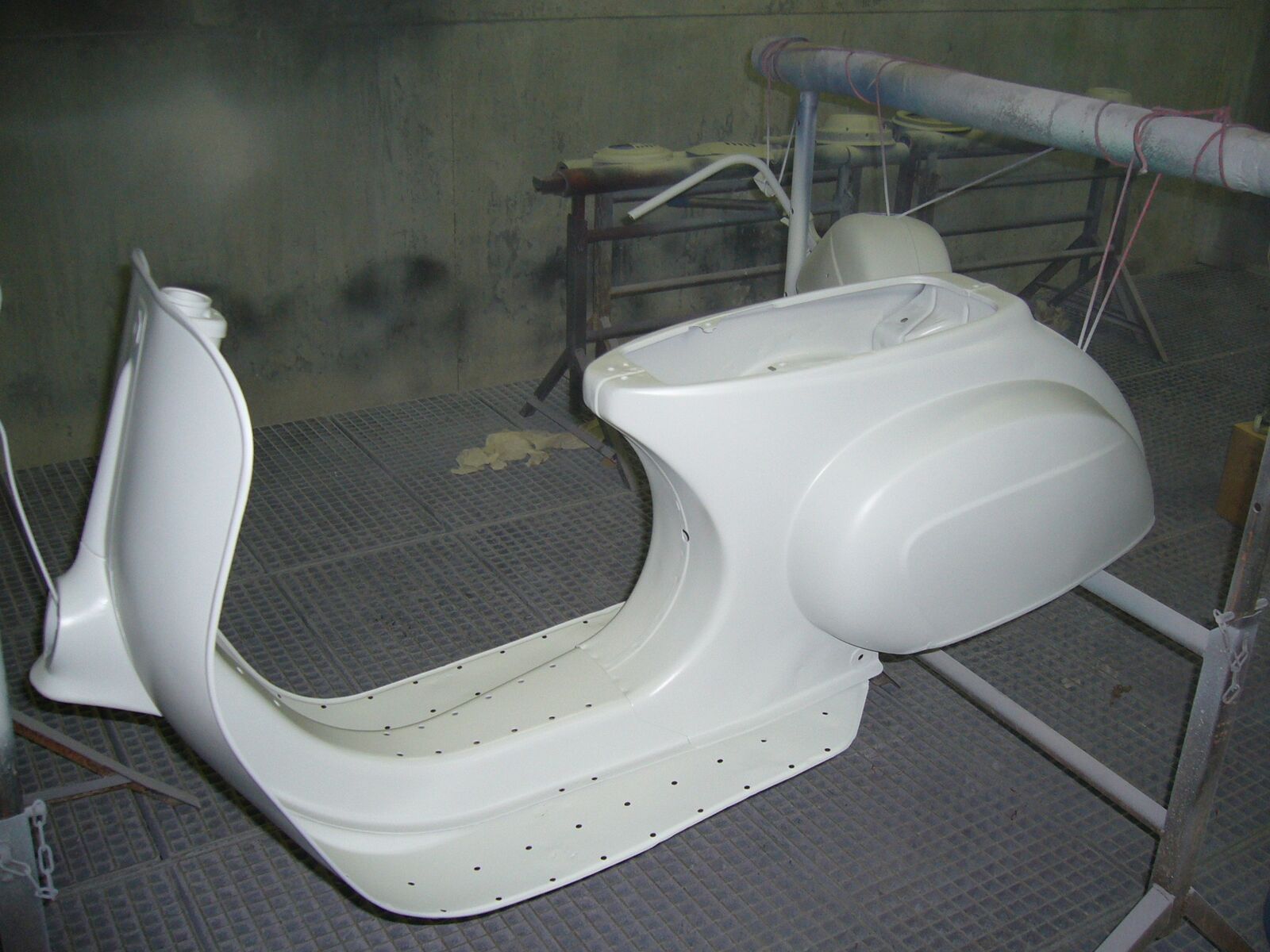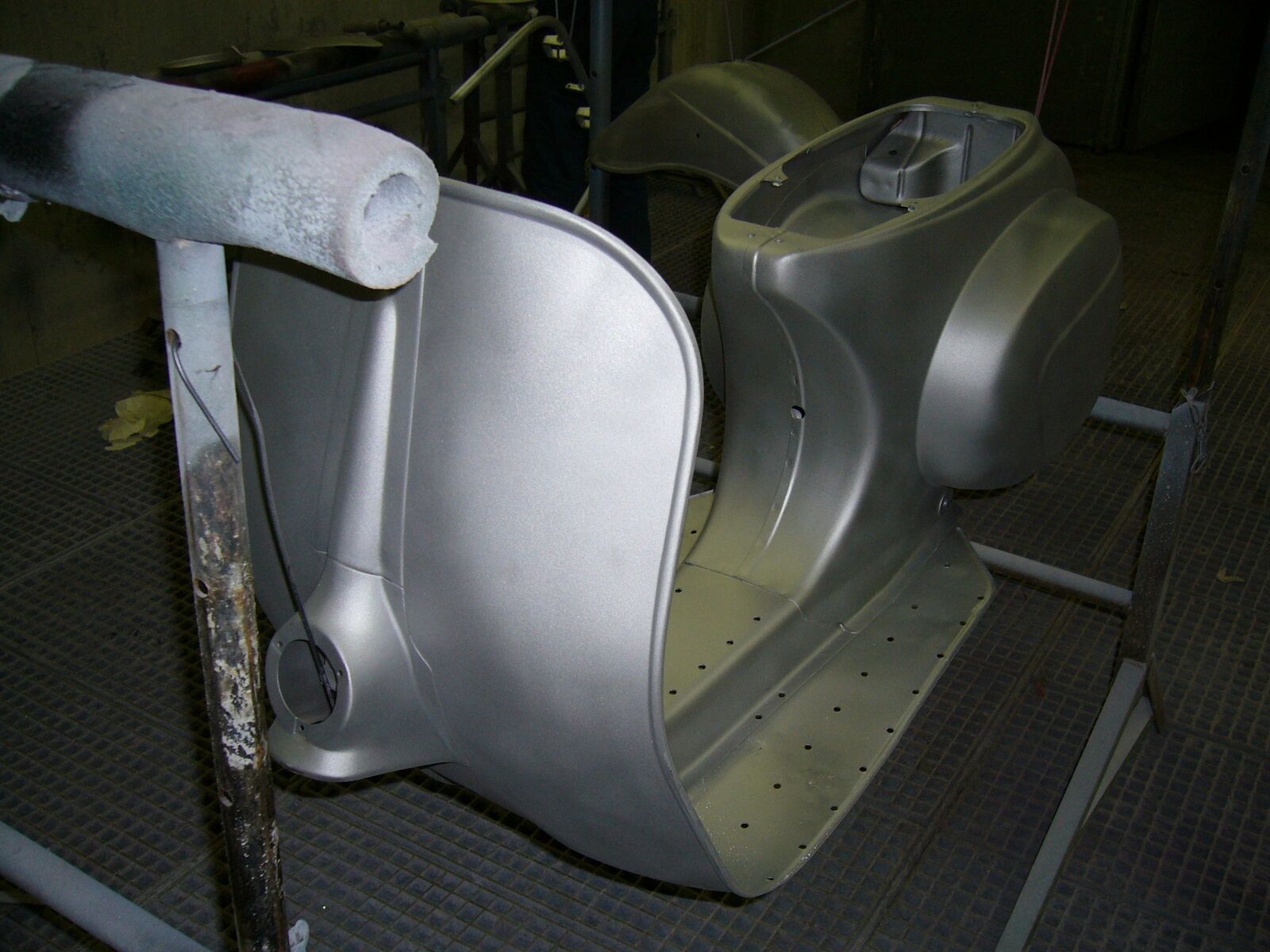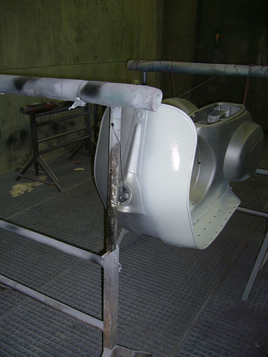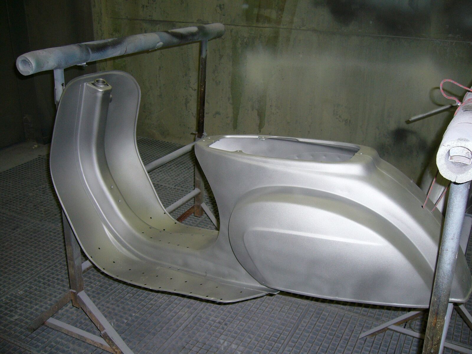 In der Werkstatt angekommen, das Teil angefangen zu zerlegen bis auf die letzte Schraube. Dann die offensichtlichen Vibrationsrisse und Rostlöcher verschweist und voller Hoffnung zum Sandstrahlen gebracht. Das Strahlen brachte dann leider doch einige Roststellen zum Vorschein, was dazu führte, dass nun doch das Trittblech getauscht wird - soll ja schließlich hinterher dastehen wie neu. Vor der Schweißarbeit noch kurz grundiert, damit das schöne Blech nicht gleich wieder Lochfraß ansetzt. Wenn des Blech drin is wird naßgeschliffen und nochmal grundiert. Als Lack hab ich mir den O-Lack bei Mr. VespaGS bestellt. Wird Europagrün klatschen-)