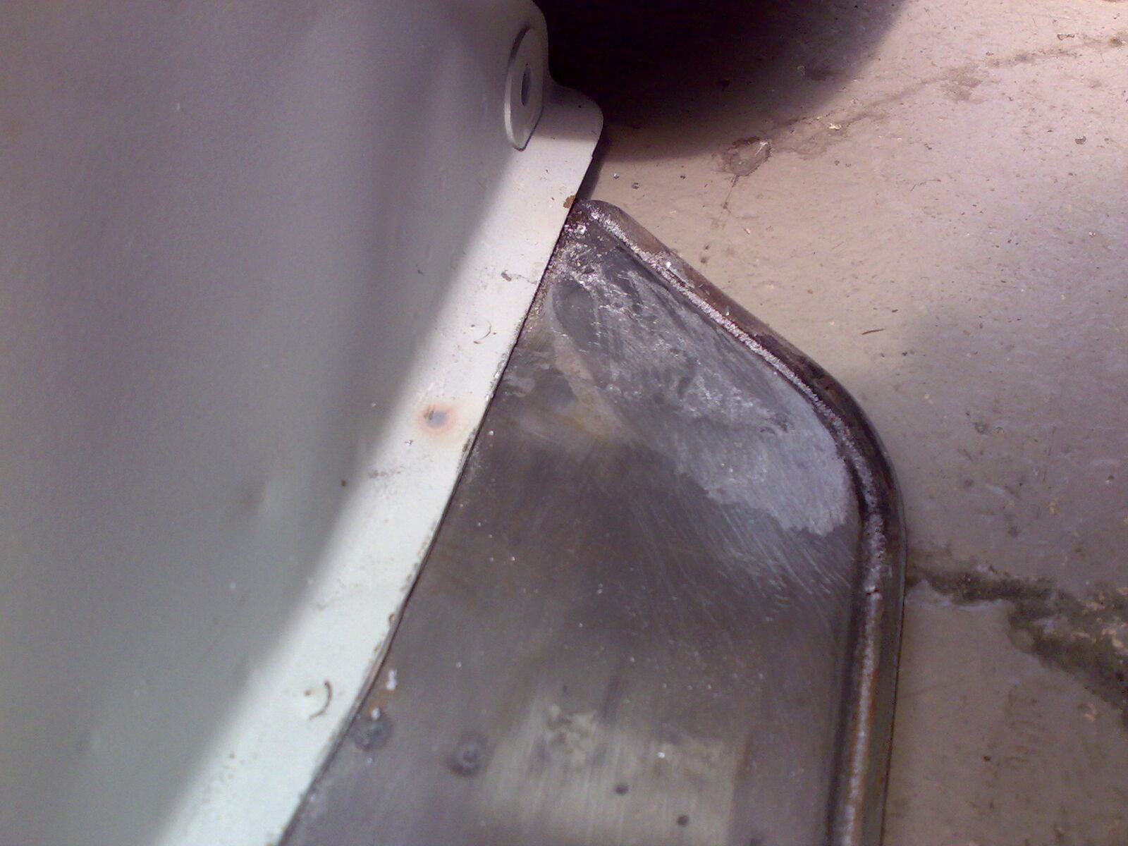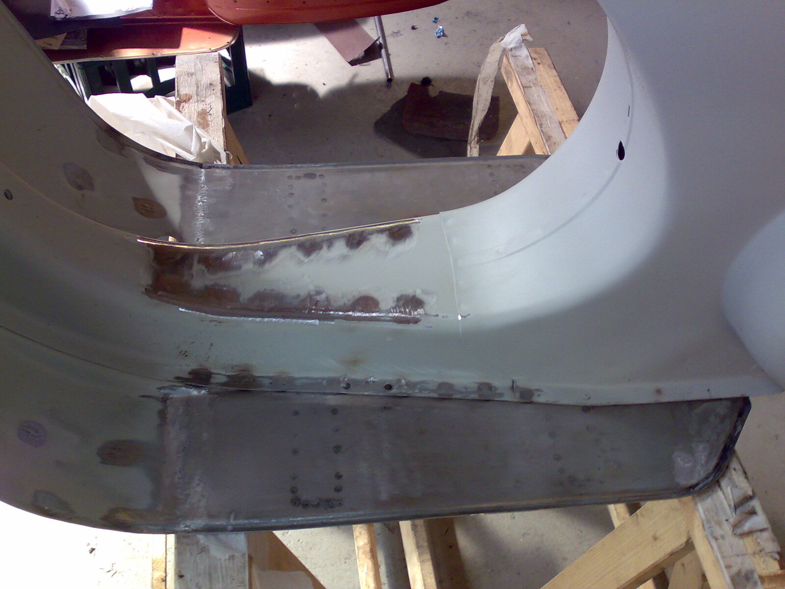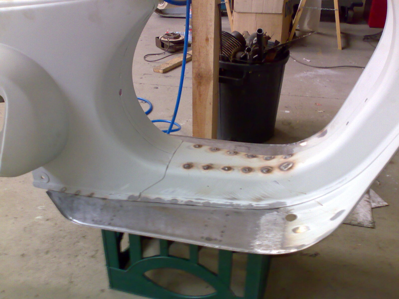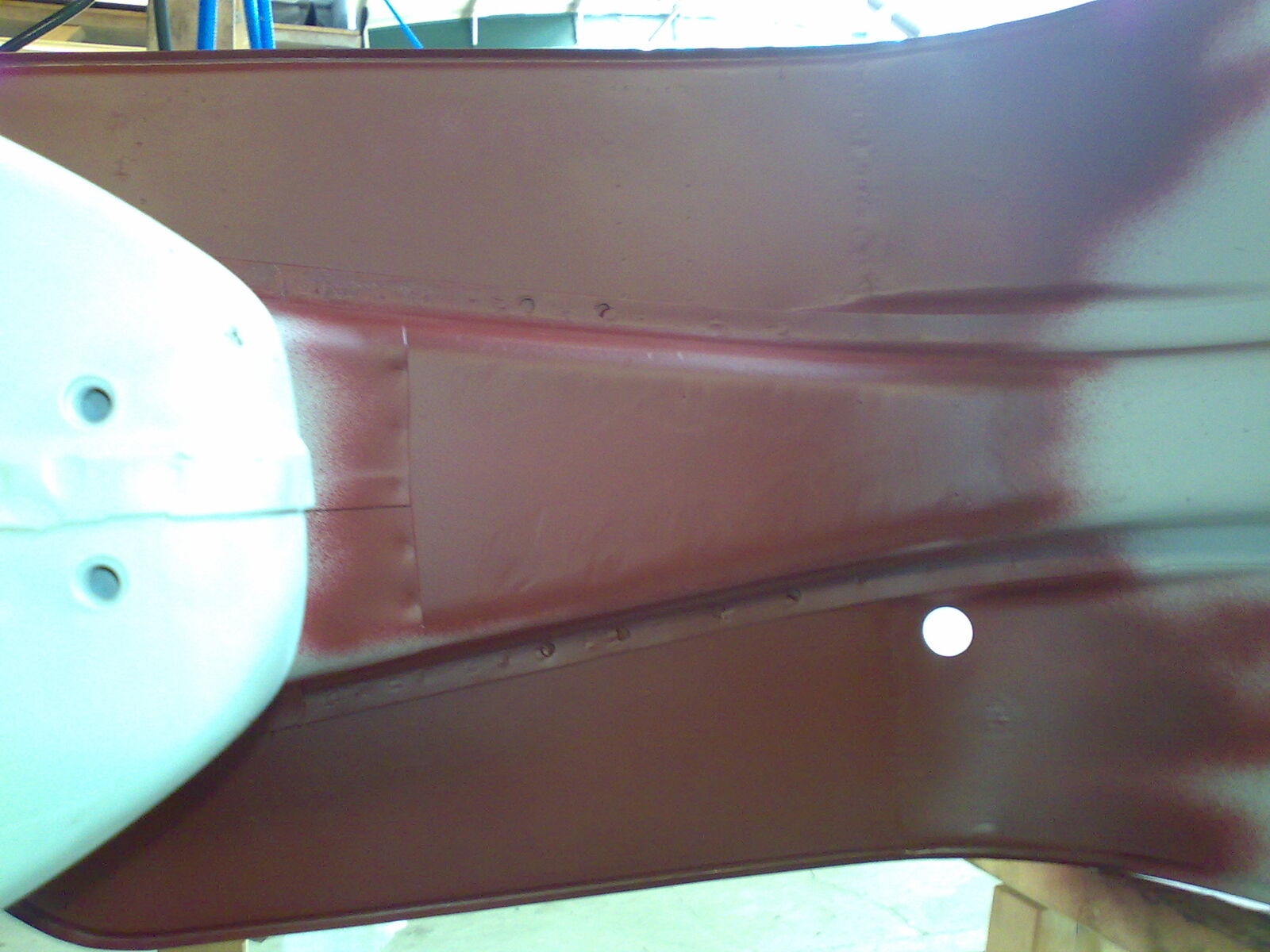Letztendlich musste man hinten wo das Blech die Ecke macht das Rep.Blech aufschneiden, umbiegen und ein neues dreieckiges Blech einsetzen und verschweißen. Soll heißen dass das Rep.Blech eigentlich von der Form her schei.... ist. Aber gut, mit viel Arbeit gings dann ja doch wie man sieht. Die Streben waren an dem Blech von vornherein dran.