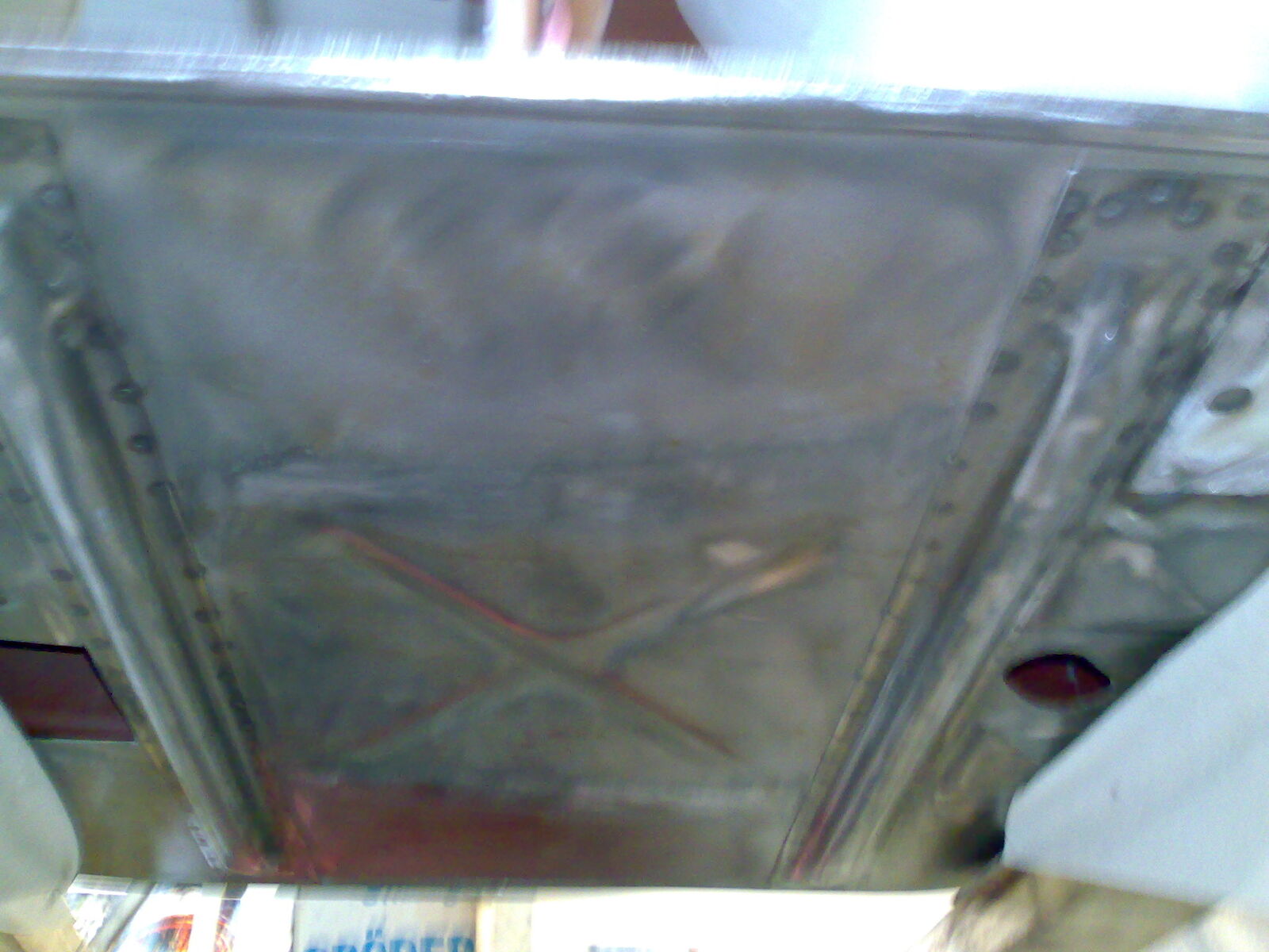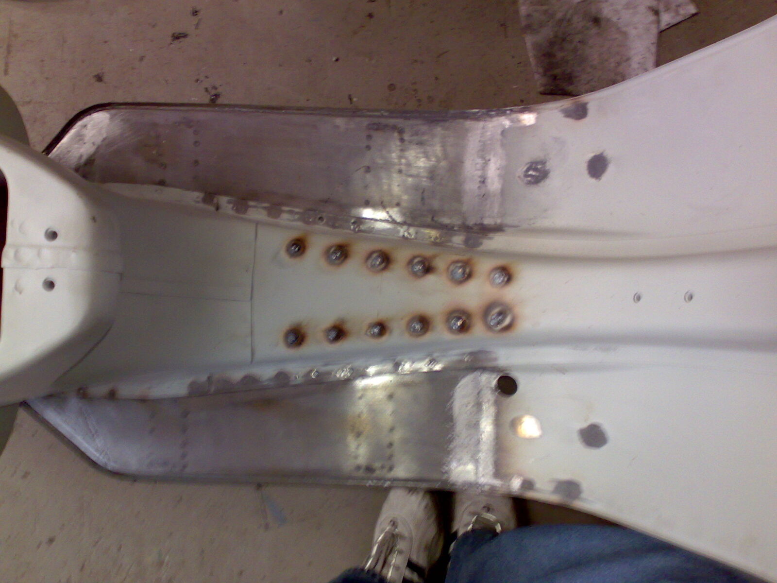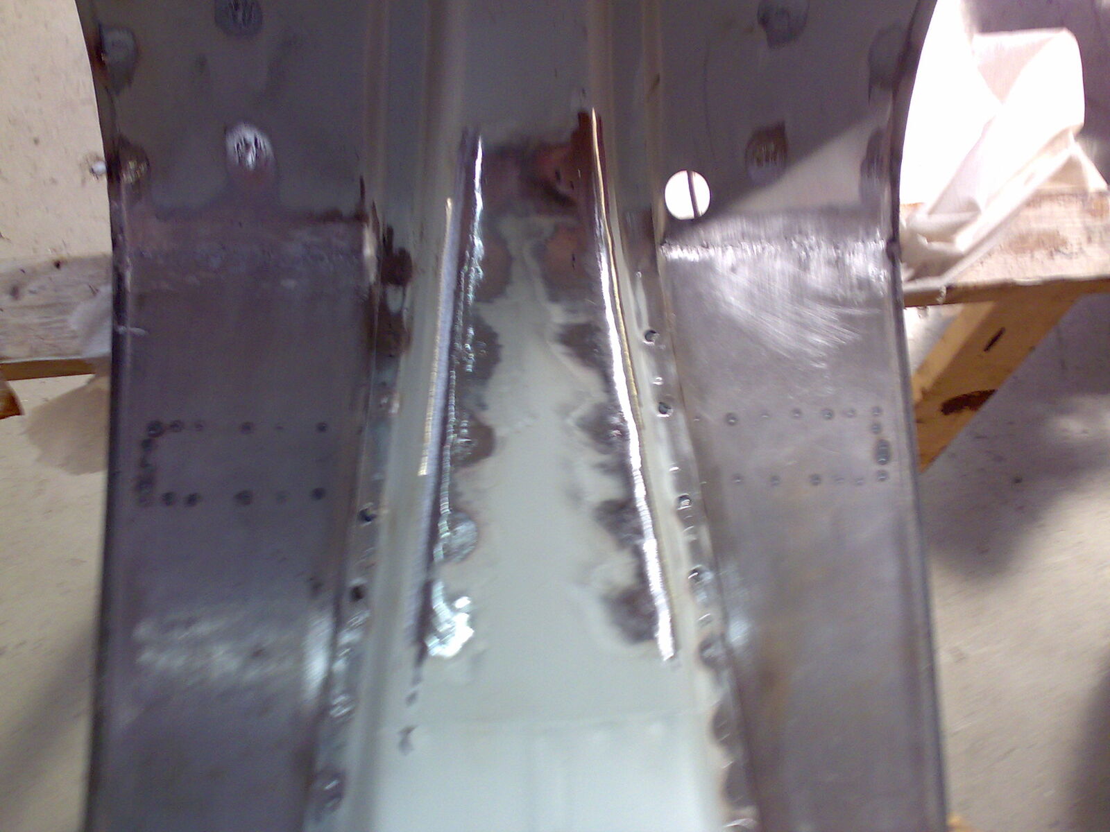 Letztendlich musste man hinten wo das Blech die Ecke macht das Rep.Blech aufschneiden, umbiegen und ein neues dreieckiges Blech einsetzen und verschweißen. Soll heißen dass das Rep.Blech eigentlich von der Form her schei.... ist. Aber gut, mit viel Arbeit gings dann ja doch wie man sieht. Die Streben waren an dem Blech von vornherein dran.