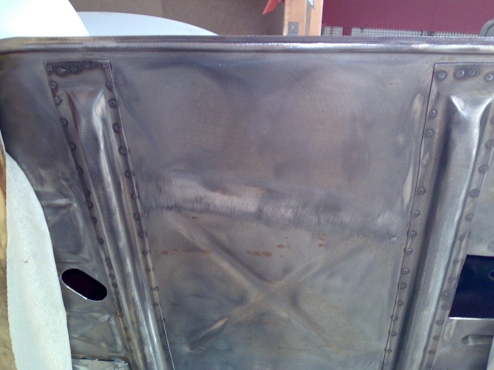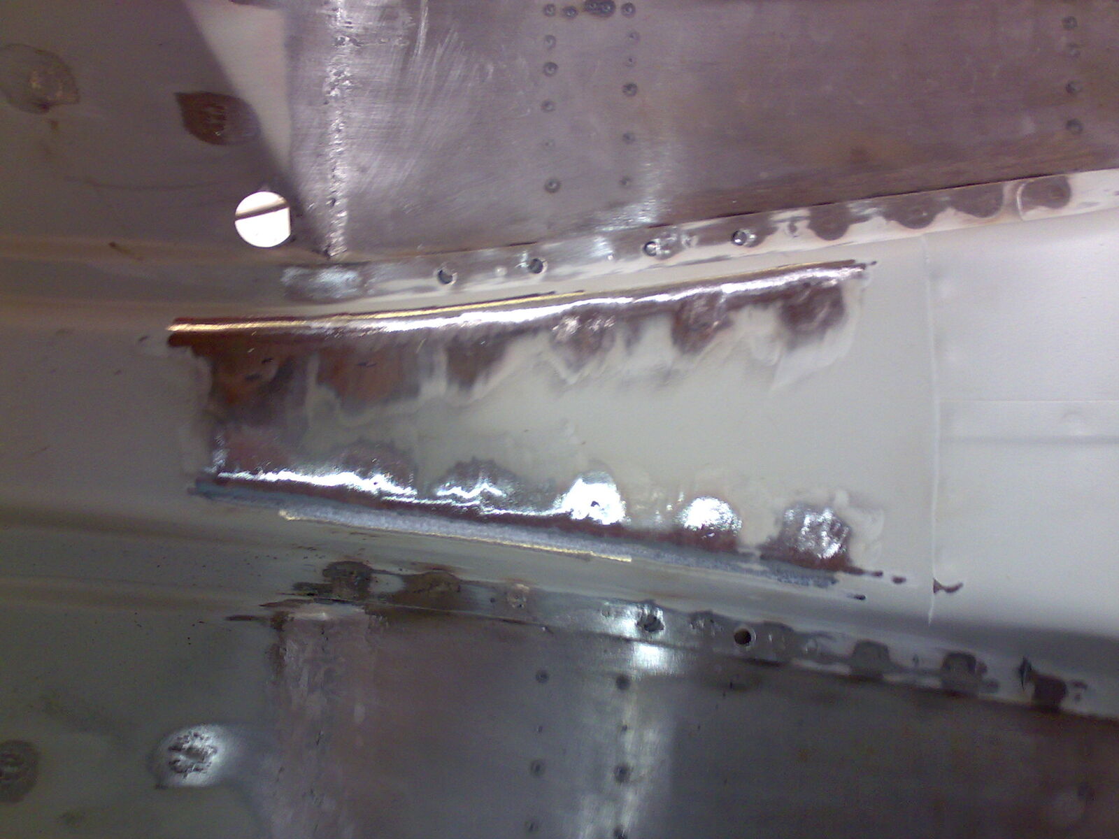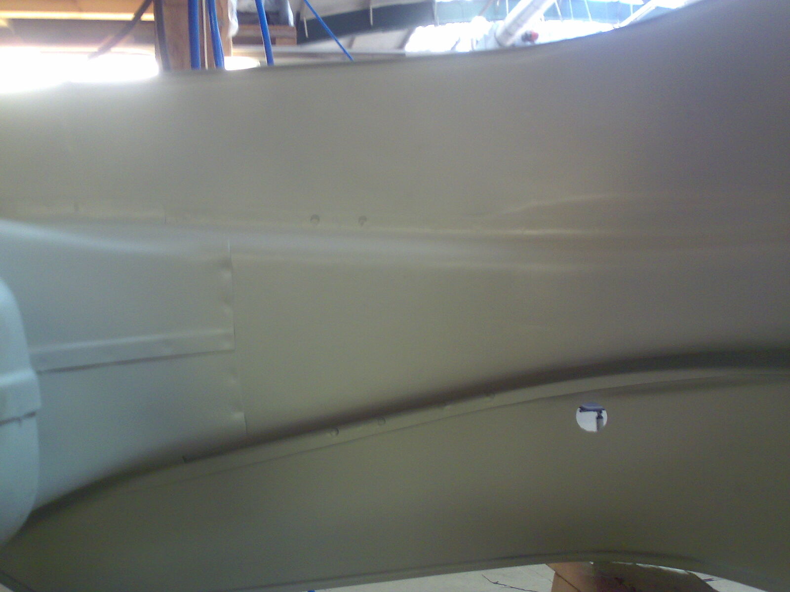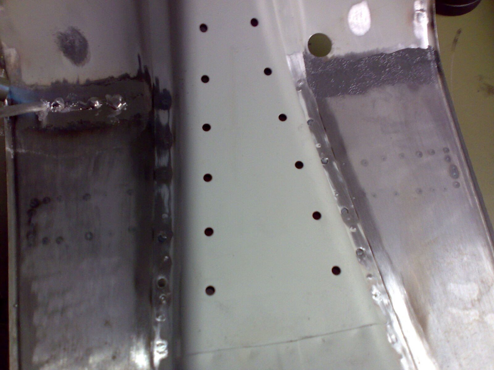 Letztendlich musste man hinten wo das Blech die Ecke macht das Rep.Blech aufschneiden, umbiegen und ein neues dreieckiges Blech einsetzen und verschweißen. Soll heißen dass das Rep.Blech eigentlich von der Form her schei.... ist. Aber gut, mit viel Arbeit gings dann ja doch wie man sieht. Die Streben waren an dem Blech von vornherein dran.
