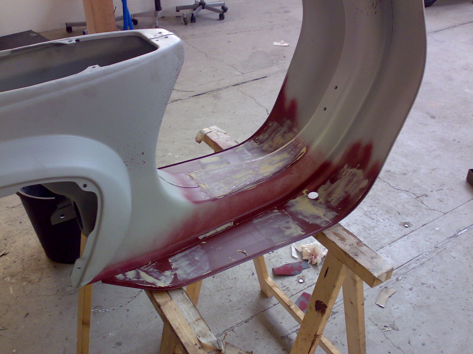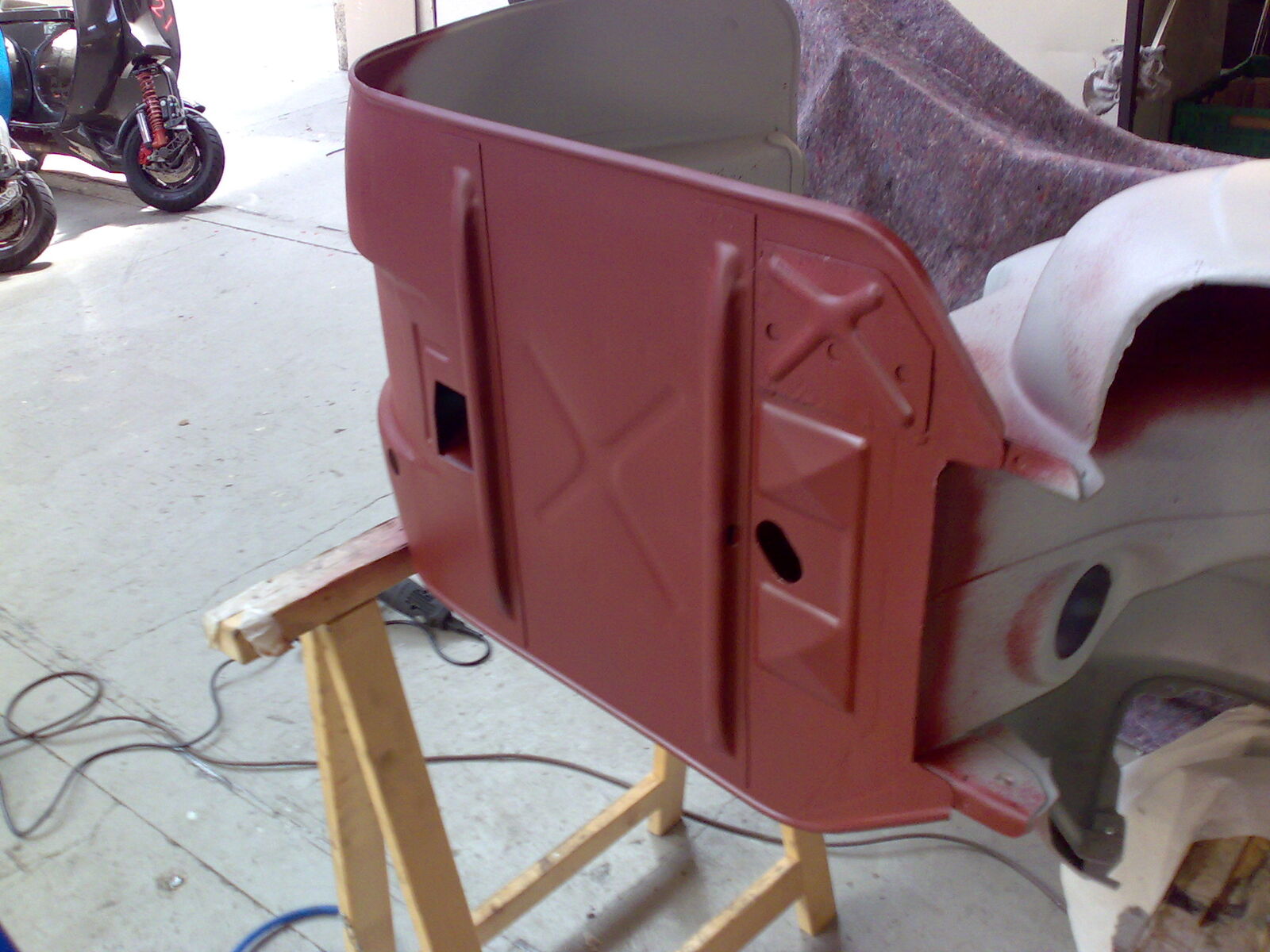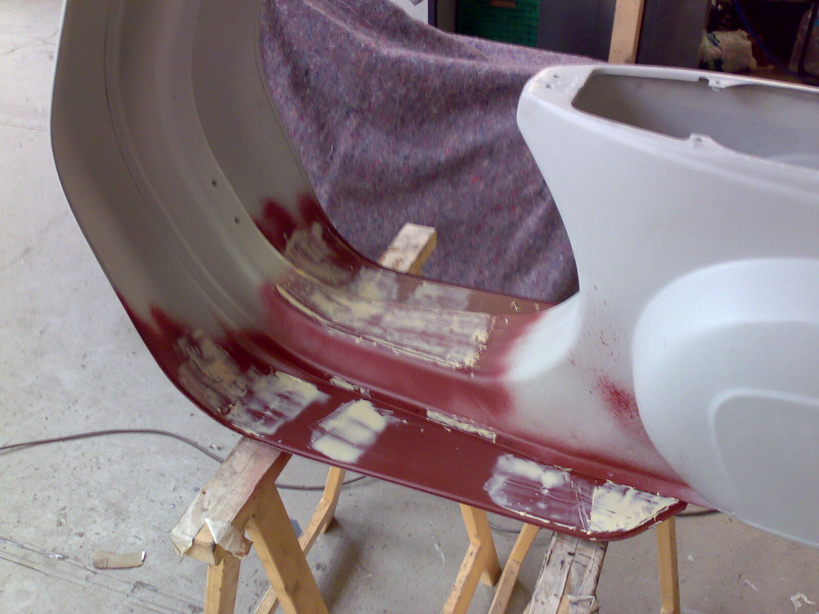 • Und weiter gehts im programm. Hab heute das Trittblech zuerst mit Rostschutz eingesprüht und dann gespachtelt. Nachm Spachteln war wieder schleifen angesagt - was für eine stupide Arbeit kann ich da nur sagen. Danach das ganze dann wieder schön mit Füller eingnebelt und feierabend gemacht :)