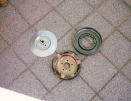 Geholfen hat ein handelsüblicher Abzieher mit Holzkonstruktion und ein paar schläge mit dem Hammer. Mußt aber aufpassen, dass Du die Scheibe nicht verbiegst und damit eine Unwucht reinbekommst.