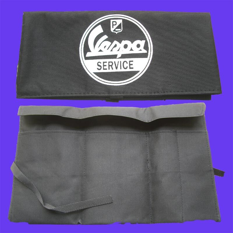 Hi, na ja jeder kennt doch so eine Werkzeugtasche, mit Unterteilungen für die einzelnen Teile. Wer einen Wochenmarkt und eine Nähmaschine zur verfügung hat, für den ist das kein Problem so etwas zu zaubern. Man braucht einen Streifen Kunstleder con ca . 40 cm breite. Da schlägt man jetzt unten etwa 10 cm um und näht das seitwärtz zu. Dan unterteil man die einstandene Tasche in einzelne Streife. Zum Schluss oberhalb noch so vie Material stehen lassen, das man eine Lasche hat welche über die Werkzeuge reicht. Den Rest abschneiden. Werkzeuge einfüllen, Lasche zuklappen und zusammenrollen. Mit altem Schnürriemen zusammen binden und fertig ist. Man kann aber auch eine bei E-Bay kaufen, kommt dann aus Asien MIT Piaggio Logo drauf, kostet fast nix, aber das Porto.