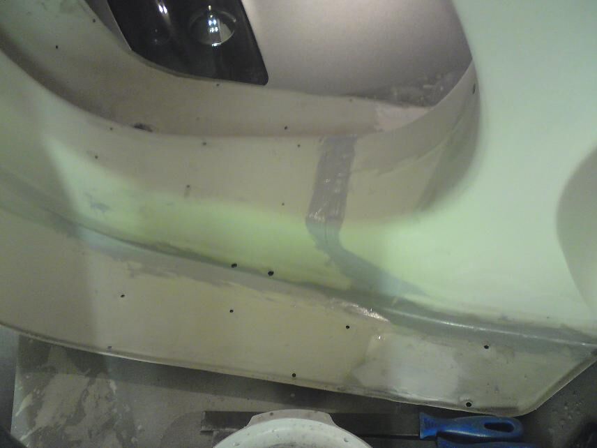 Ich habe nun das Blech komplett blank geschliffen und die Fuge augekratzt, damit der ganze Schmutz und Rost weg ist. Die so vorbereitete Stelle sah sehr gut aus, weshalb ich sie so auch grundiert und lackiert habe.