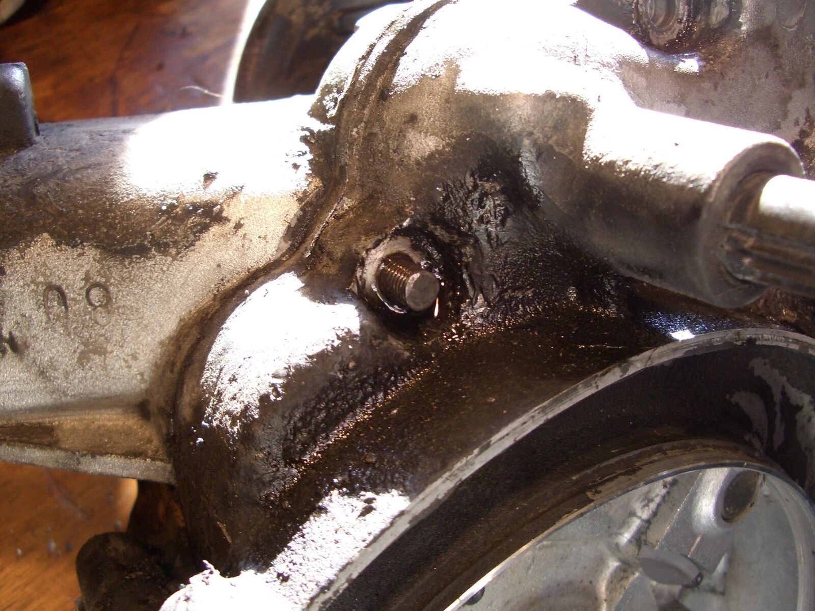 Ich habe den groben Dreck durch das Schwingenloch rausgewaschen und dann mit reichlich WD40 2 Tage lang stehen lassen. Dann den Motor sicher durch zweiten Mann auf einem Hartholzklotz aufgelegt und mit Mut und Verzweiflung mit einem Fäustel auf den Bolzen geschlagen. Vorher habe ich das Gehäuse noch schön warm gemacht. Beim 3. Schlag sagte es "knack" und der Bolzen war lose. Dann habe ich das gestauchte Gewinde abgeflext und den Bolzen rausgetrieben.