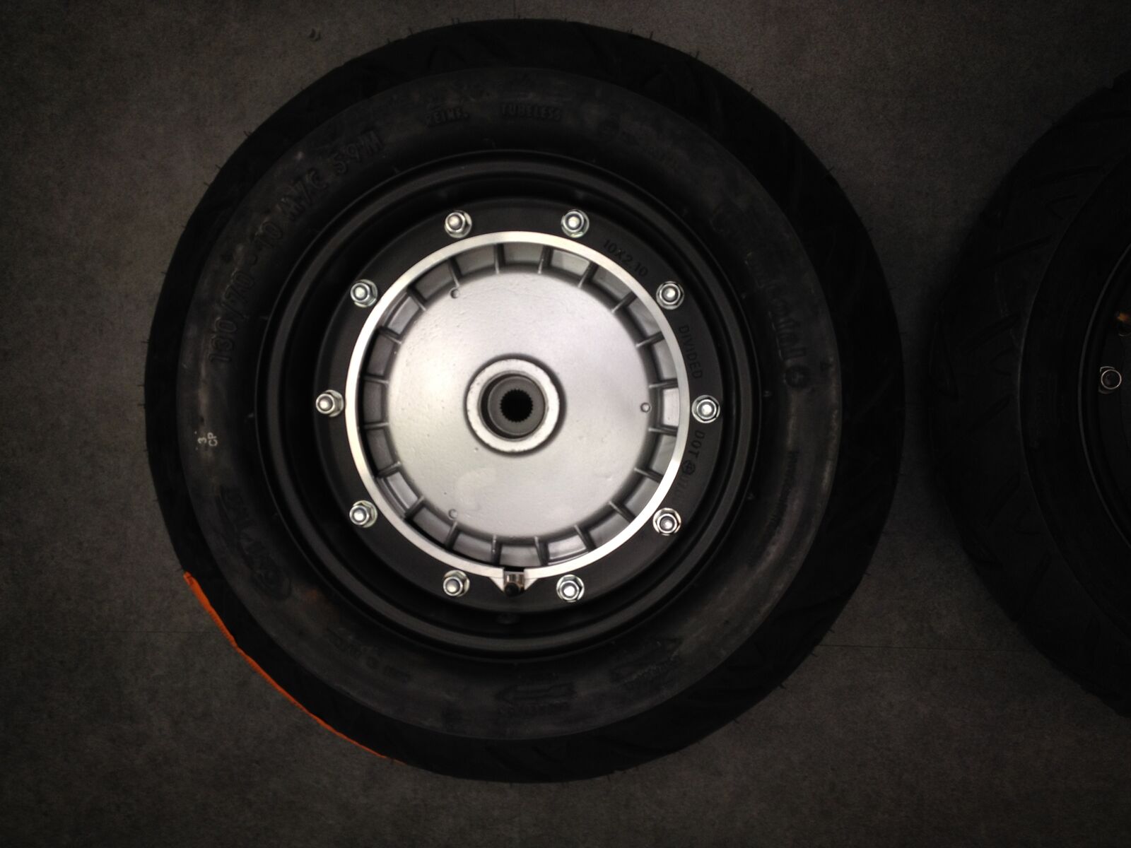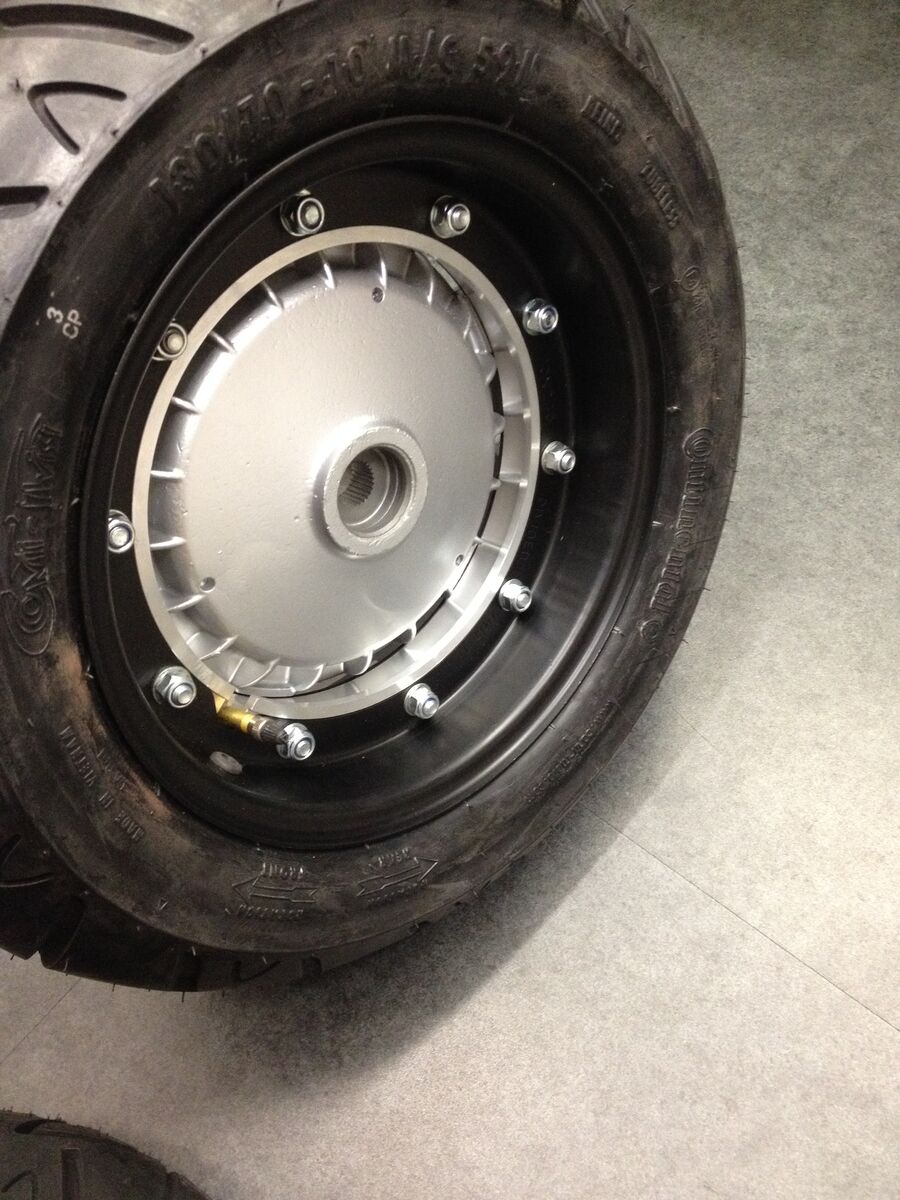 Hinten 3,5 Felge mit 130/70 10 Breitreifen und vorne 2.1 Felge mit normalo Reifen.