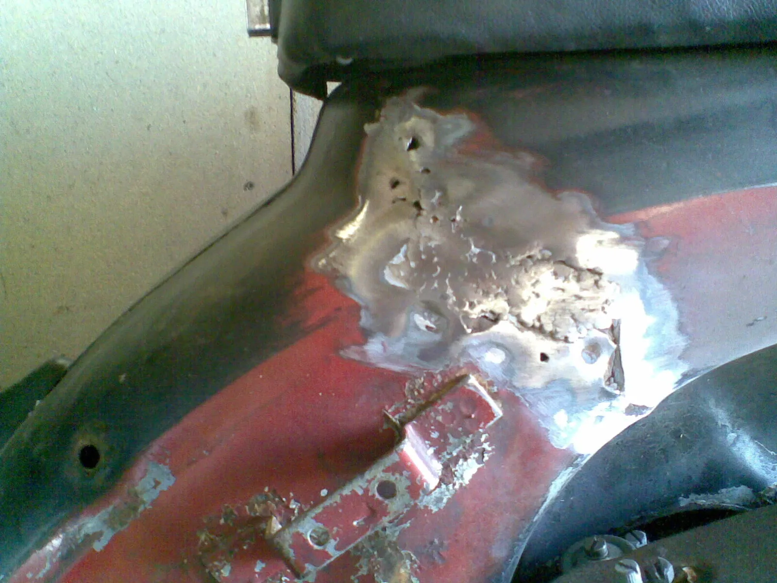 Mir war klar, dass an der Karosserie einiges zu tun ist, insbesondere muss das Trittblech ersetzt werden, auch angrenzende Partien dürften einiges an Arbeit erfordern. Überrascht hat mich allerdings bei einer näheren Inspektion ein merkwürdiger Schaden am Rahmen rechts oberhalb des Motors bzw. unterhalb der Sitzbank. Dort weist die Karosserie einige kleine Durchrostungen auf und es scheint als sei dort schon einmal ein rechteckiges Blech reingebrutzelt worden. Ich habe die Stelle mit dem Negerkeks freigelegt, damit man Art und Umfang des Schadens klar erkennen kann.