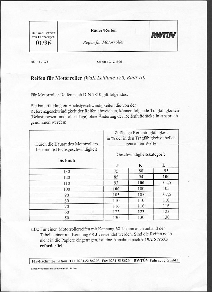 Damit wäre die zulässige Höchstgewindigkeit für z.B. 3,50-10 Heindau K58 mit Geschwindigkeitsindex J=100Km/h überschritten, obwohl dieser Reifen für Cosa 200, PX 200 ... von vielen Reifenanbietern freigegeben wird? ![]()