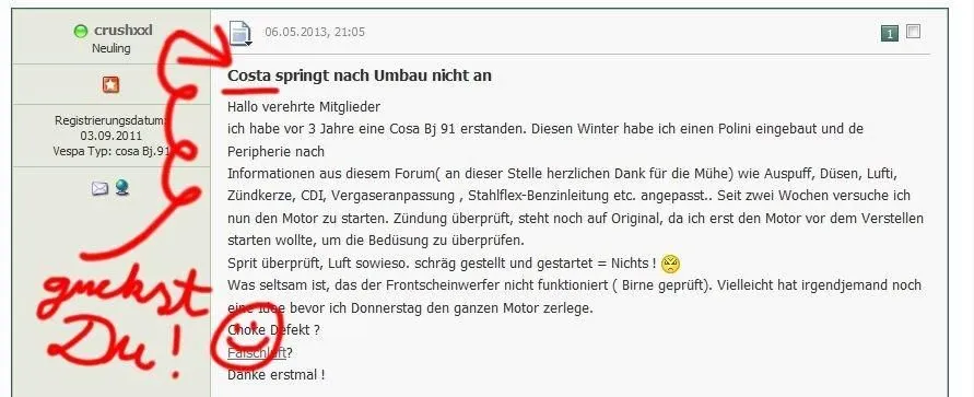 Vechs: Nur zur Info für dich: Wenn man sich auf eine Vespa setzt die auf einem Anhänger steht und damit über den Hof fährt zählt das nicht als auf der Vespa gefahren.