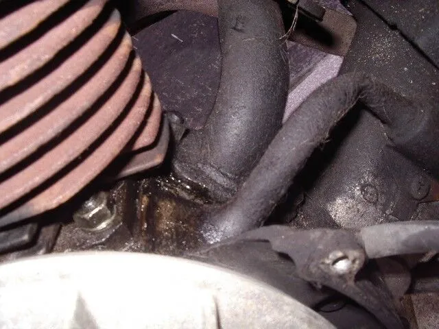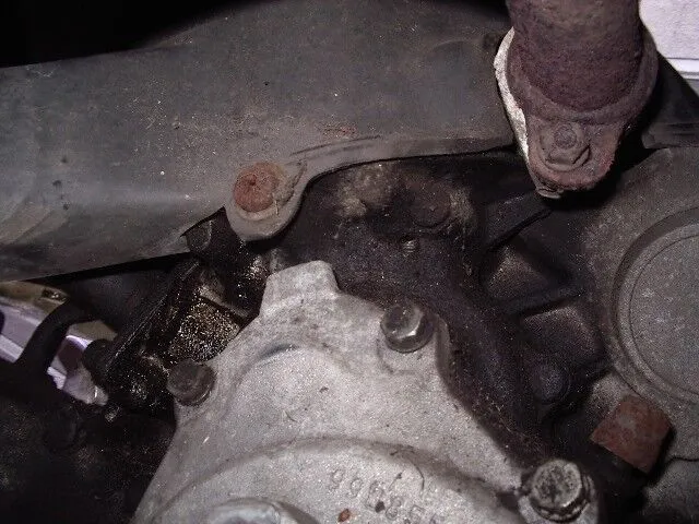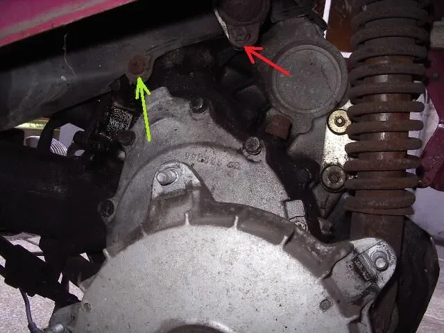 als nächstes wird der auspuff abgeflanscht (roter pfeil) und die schraube gelöst (grüner pfeil)